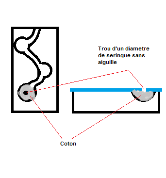 <t>Dans les nids en BC horizontal, on a une plaque de BC dans laquelle on a creusé des salles et des galeries, avec une plaque de plexi par dessus.<br/> <br/> Et bien j'avais l'idée de remplir une de ses salles avec du coton, et dans la plaque de plexi, faire un petit trou pour ré-humidifier le coto...