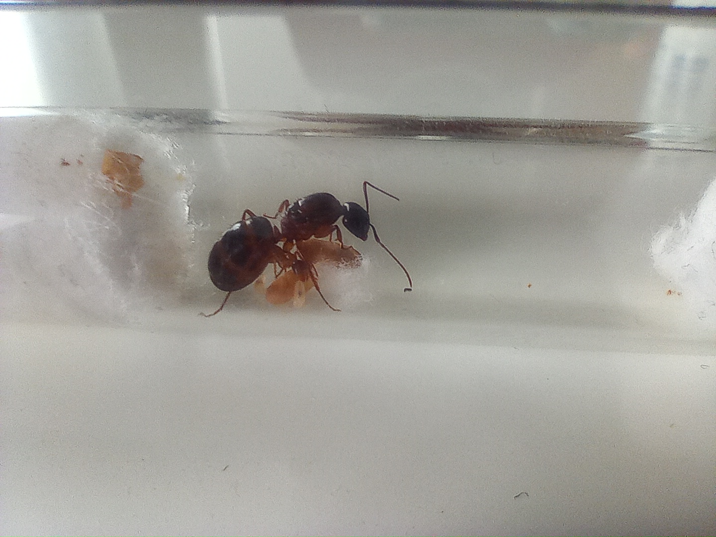 Une photo d'une de mes gynes Camponotus pilicornis avec deux œufs.
