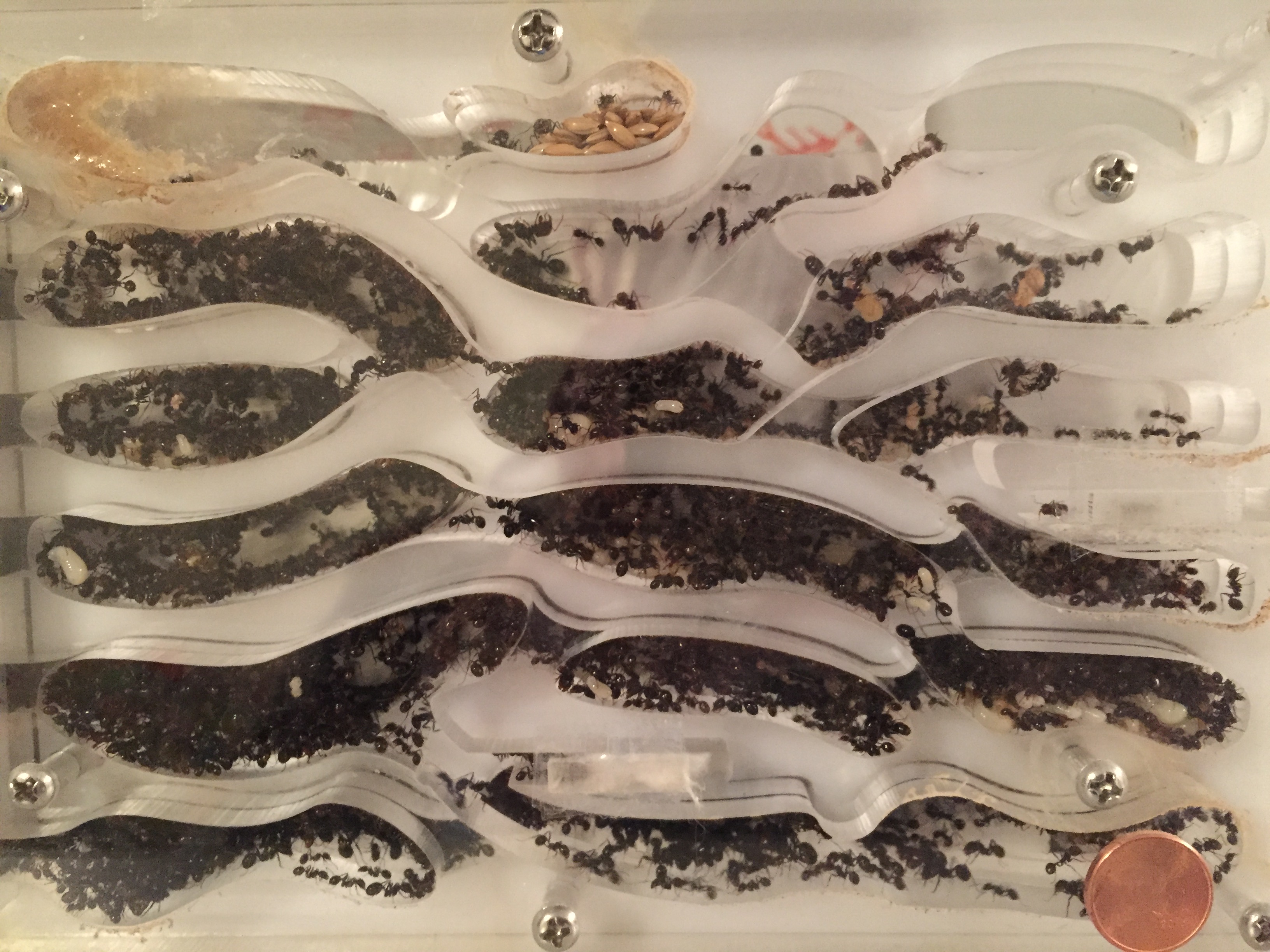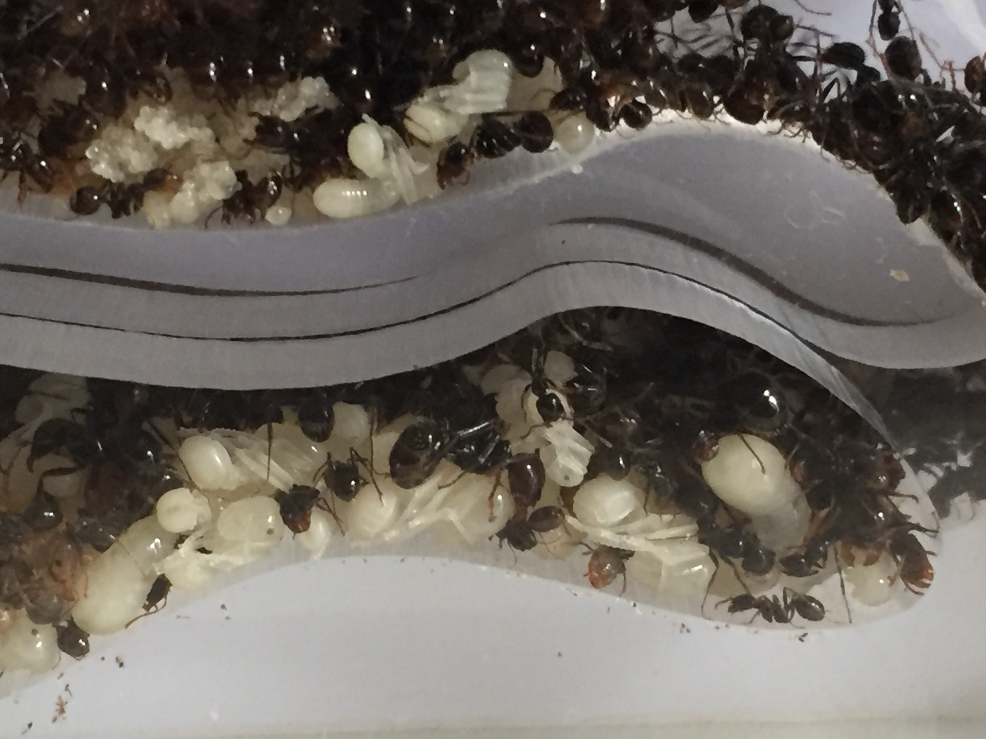 Quelques jours plus tard j'ai humidifié le nouveau nid comme je fais d'habitude, je prends une seringue et je vide la seringue directement dans la mousse bleu par le haut. J'ai pris l'habitude depuis mon ancien nid d'arrêter l'humidification dès lors que l'eau sorte par cette fameuse sortie de surplus d'eau ce qui voudra dire que la mousse est totalement humidifiée. Vous connaissez la suite... la sortie étant bouchée l'eau s'est accumulée directement dans les salles du nid. J'ai mis du temps à m'apercevoir de ma boulette, les premières salles étaient remplis au 3/4. J'ai du incliner le nid à 90 °C pour faire sortir l'eau. Bilan : au moins une centaine de fourmis piégées dans l'eau mais heureusement la majorité a survécu.