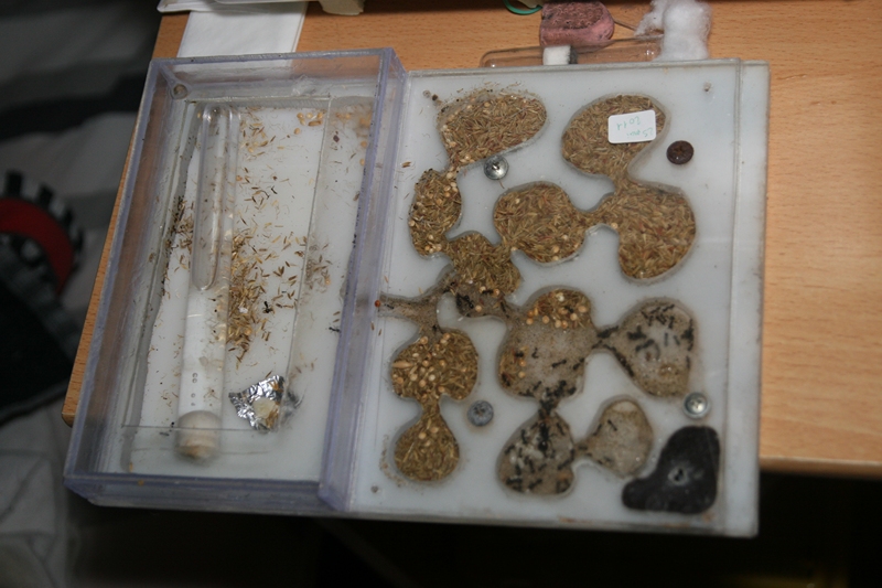Le 8 mai 2013, après une croissance importante, la colonie a en effet doublé en nombre, elle était à la limite des 1 000 individus. On peut le remarquer sur cette image du nid. Malheureusement je n'avais pas surélevé le nid, il a moisi avec l'humidité par le dessous. En ce qui concerne les ADC, j'avais mis de l'huile de paraffine comme anti-évasion, j'ai préféré l’enlever pour mettre un anti-évasion manuel, c'est à dire juste une plaque avec une grille. Les Messor sont vraiment pas à l'aise sur les parois verticales à l'envers. On peut voir le stock de graines qui s'accumule.