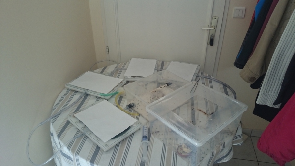 J'ai donc forcément fait une nouvelle installation. Pour cela j'ai du créer un nid de 40*50cm en plexiglas avec fond en plâtre. Et pour faire rentrer tout ce petit monde dedans, et bien j'ai ouvert les ADC, donc j'ai aspiré tout ce qu'il y avait !