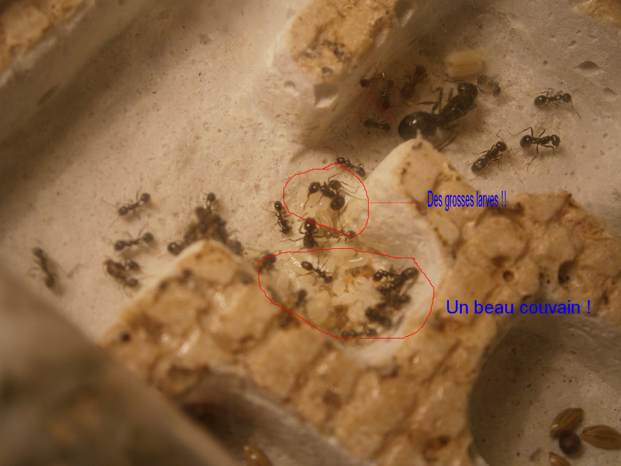 Cette colonie vient seulement de reprendre son développement car elle a connu bien des mésaventures (nid fissuré), donc déménagement mais refus de celui-ci, alors déménagement de force mais la reine a stressé toute l'année, jusqu’à maintenant.