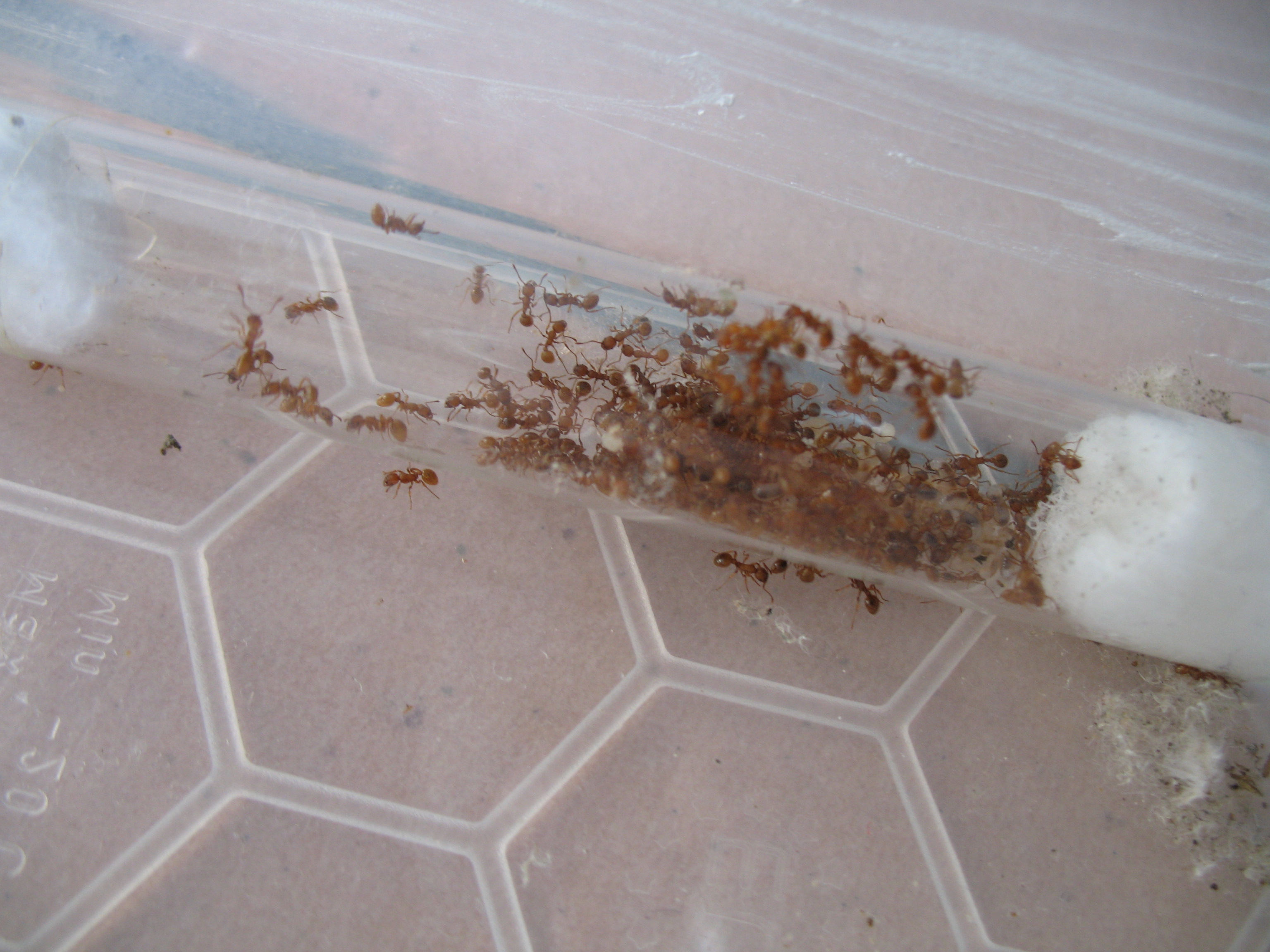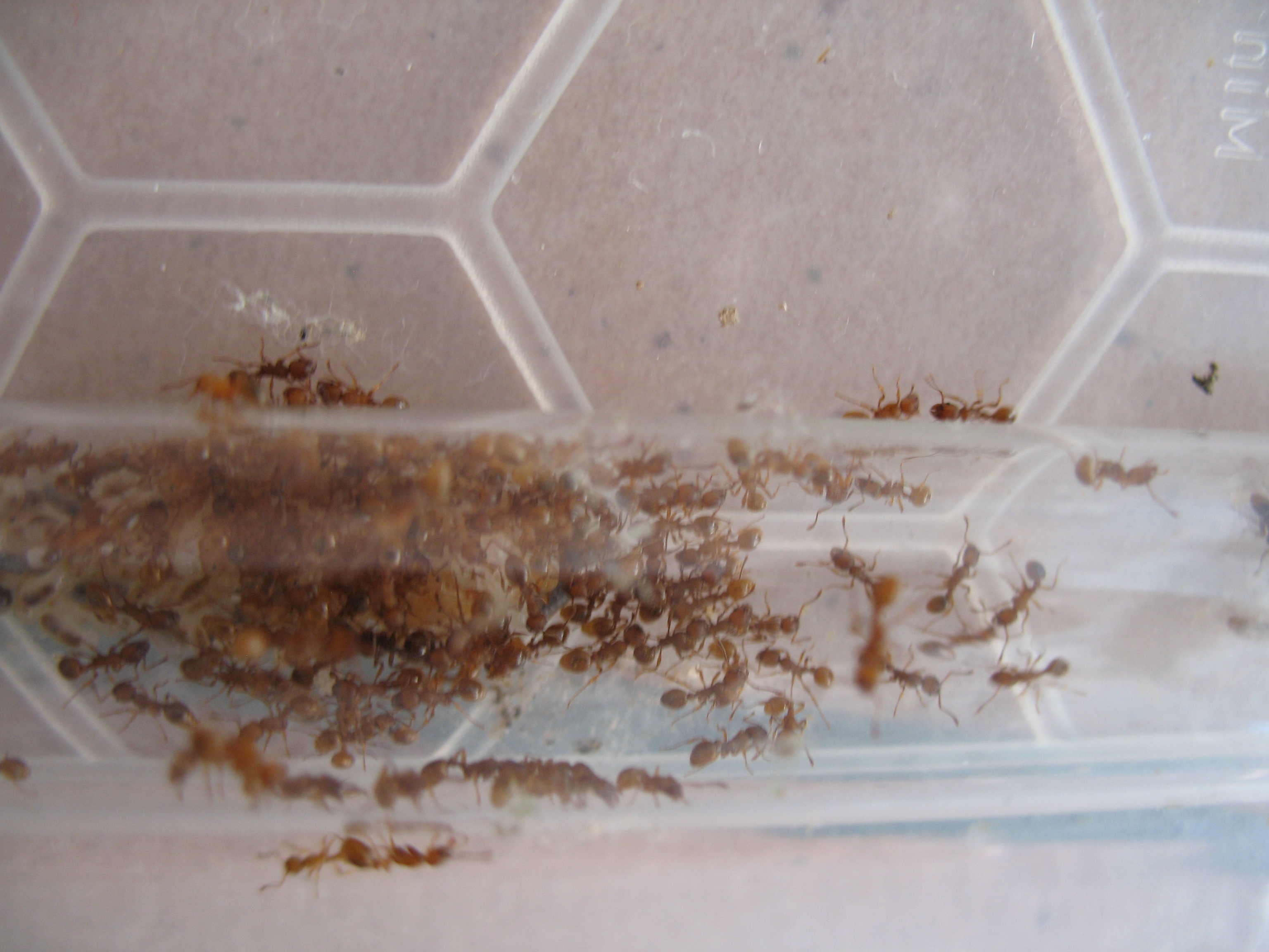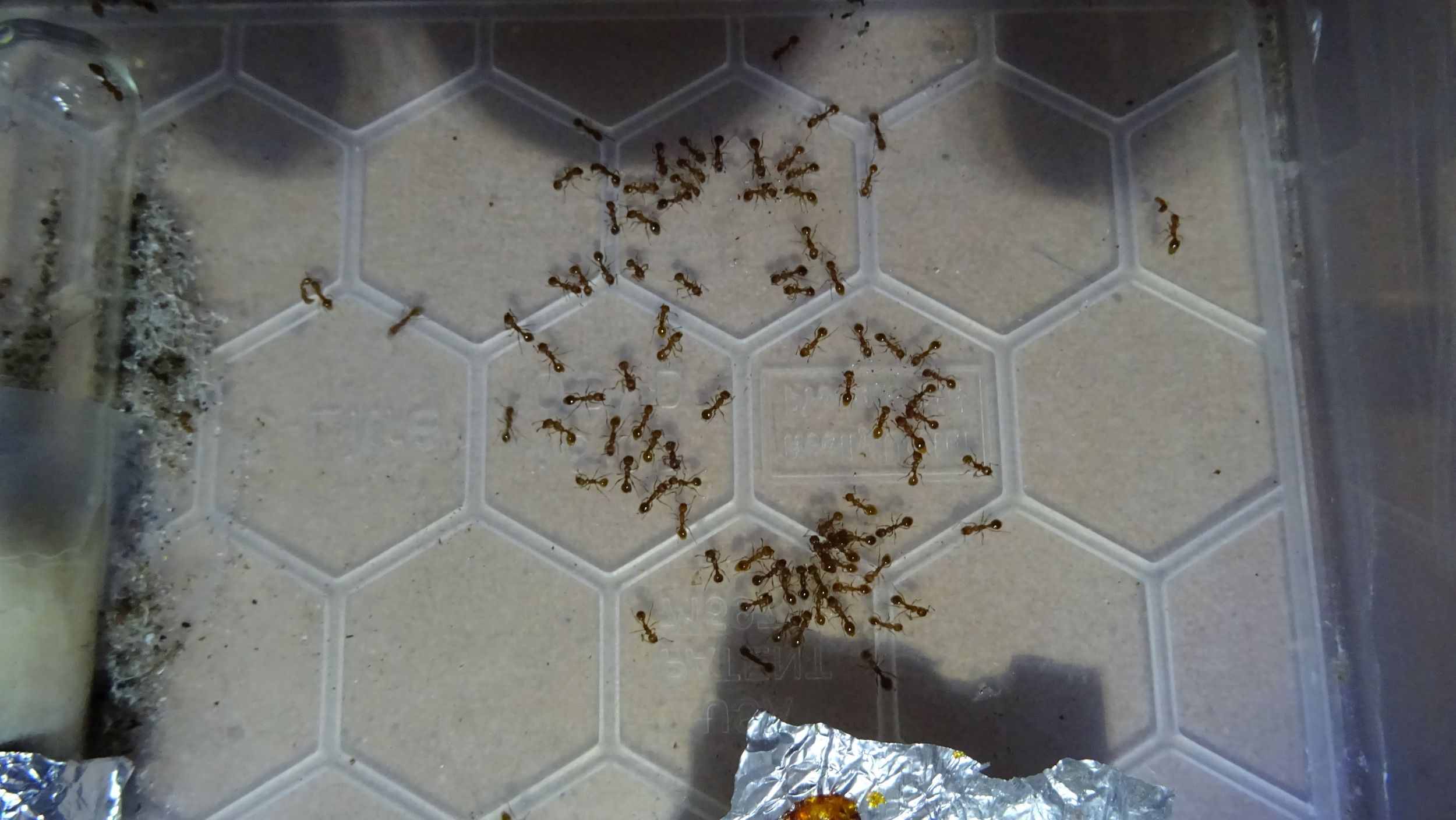 Ensuite ce sont des fourmis qui ont une faible possibilité de stockage de la nourriture, elles font peu (pas ?) de trophallaxies et tout le monde sort quand le repas est servi, ce qui rend l'observation intéressante. L'inconvénient c'est qu'elles sont plutôt du genre fragiles, elles peuvent facilement mourir en nombre pendant la diapause ou dès que l'humidité baisse trop, ce qui explique le nombre peu élevé d'ouvrières après 2 ans d'élevage.