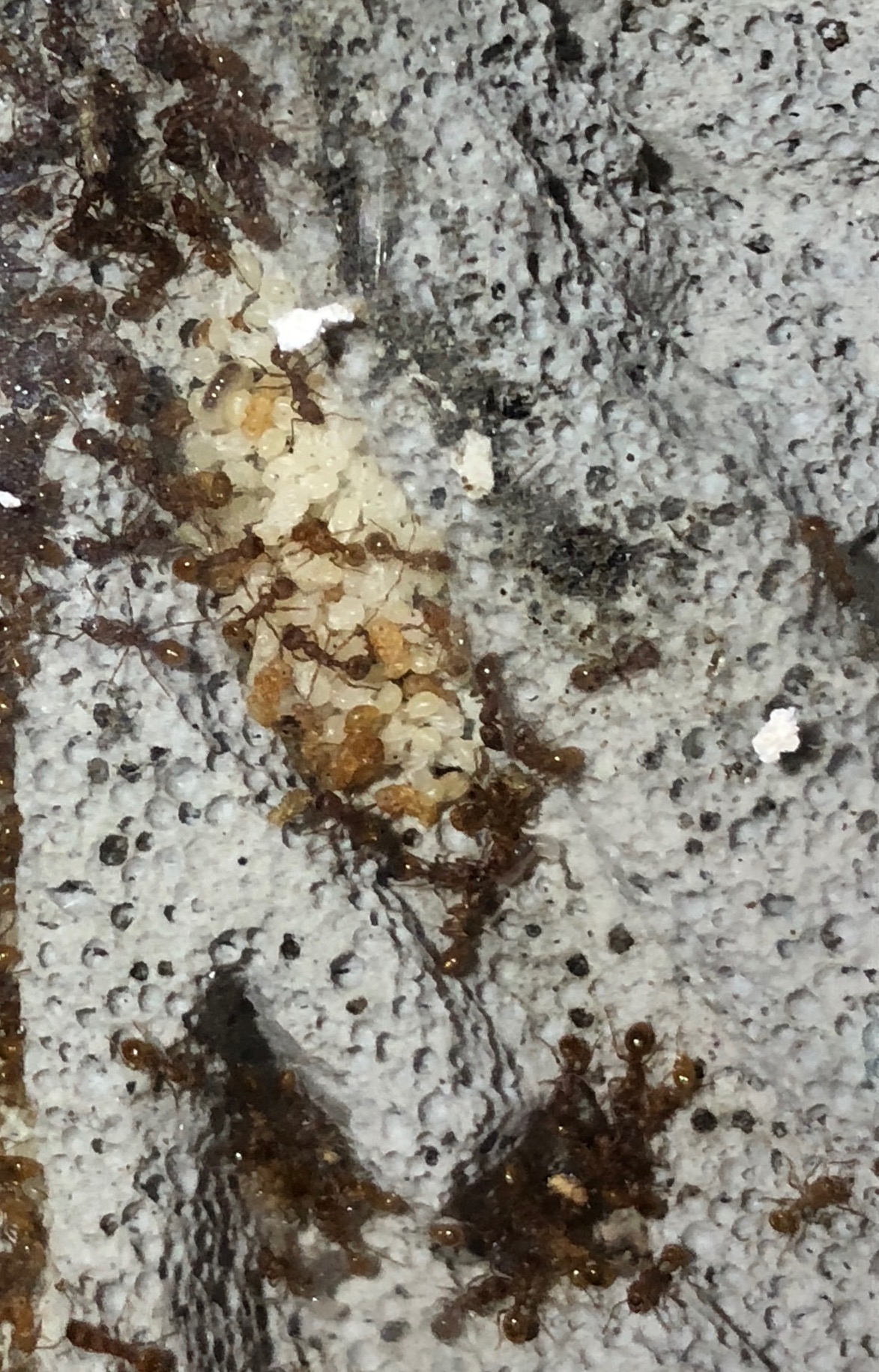 Intéressant l'élevage de cette espèce, déjà parce que la fondation est semi claustrale, il faut nourrir la gyne pendant la fondation, ce que j'ai fait avec des gouttes de pseudo miellat au bout d'un coton tige et quelques drosophiles une fois les premières larves apparues.