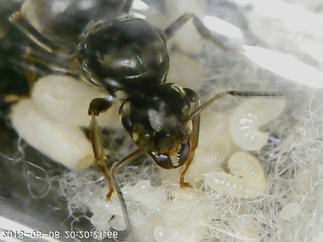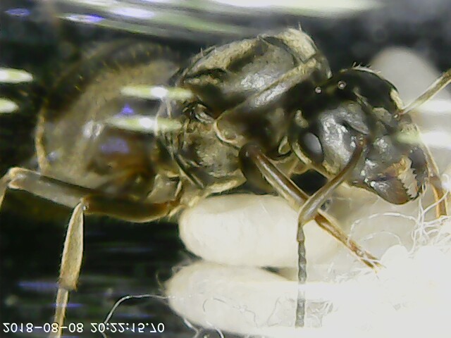 Aujourd'hui, la petite fondation est plutôt timide et apathique, mais apparement c'est normal. Les ouvrières ne sortent que très rarement, et de ce que j'ai pu observer, toujours seule (je n'ai pas toujours les yeux dessus, non plus
