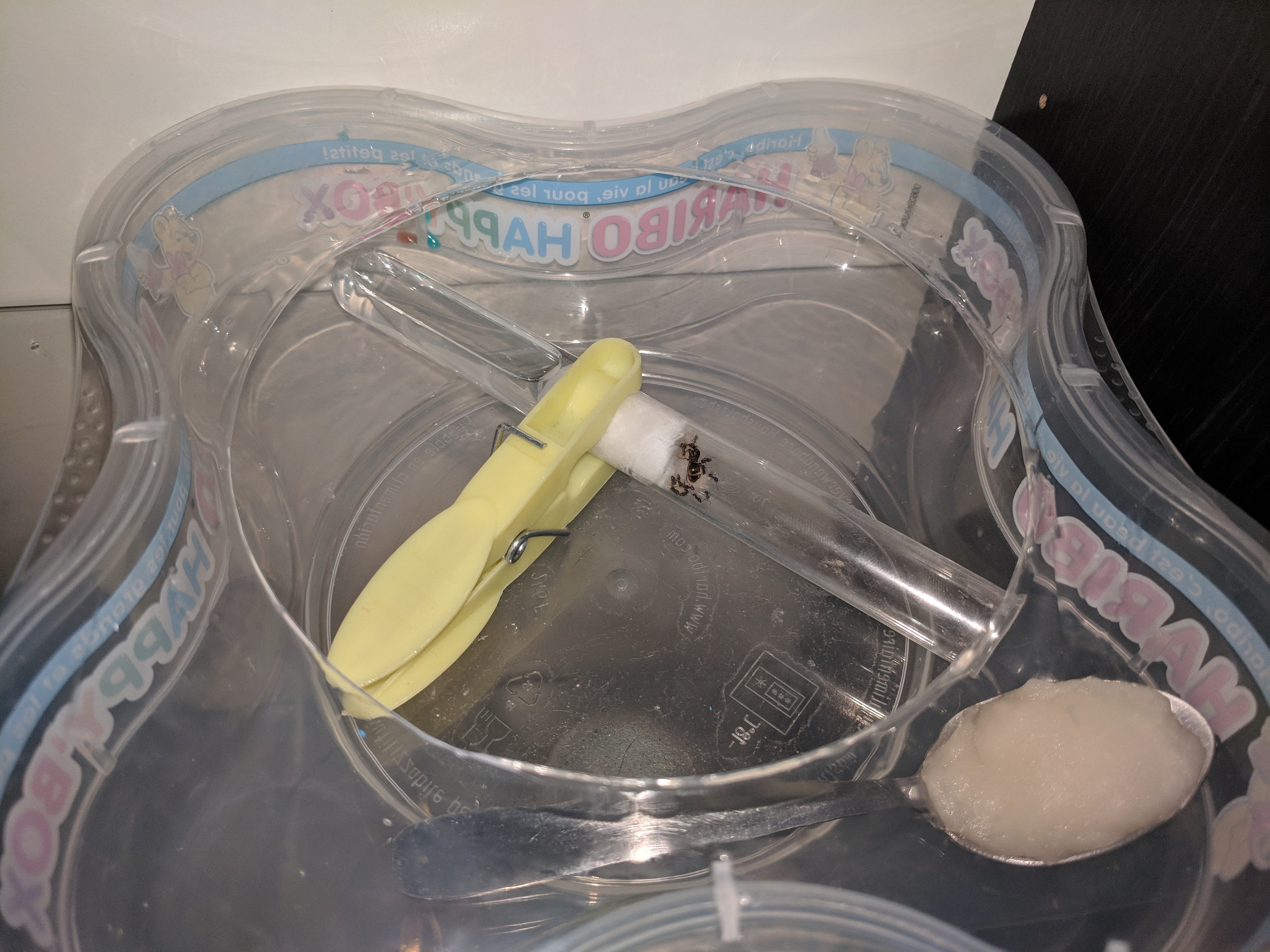 De retour de vacances, j'ai entrepris de nourrir tout le monde, mais un problème s'est rapidement posé, le coton aéré à la sale manie d'absorber le liquide, de se solidifier, puis de faire coller le coton au tube. Plus tôt que ce que j'avais prévu, j'ai donc acheté une boite à bonbons pour m'en servir d’ADF.