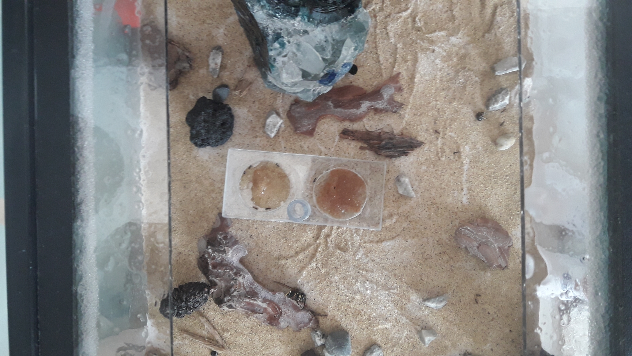 Toujours autant de couvain, ces deux dernières semaines j'ai compté environ 6 naissances par jour. Si cette démographie se poursuit elles seront presque 2 000 avant la diapause ! Hier elles ont terminé de creuser la cloison en mousse qui séparait les deux espaces de la face avant du nid. Elles ont très vite investi ces nouvelles galeries, en plaçant du couvain un peu partout. La nourriture reste identique, gelée miellée à volonté, et mouches, grillons, et criquets tous les trois jours. Elles ont droit régulièrement à de la pulpe de fruits, c'était raisin aujourd'hui.