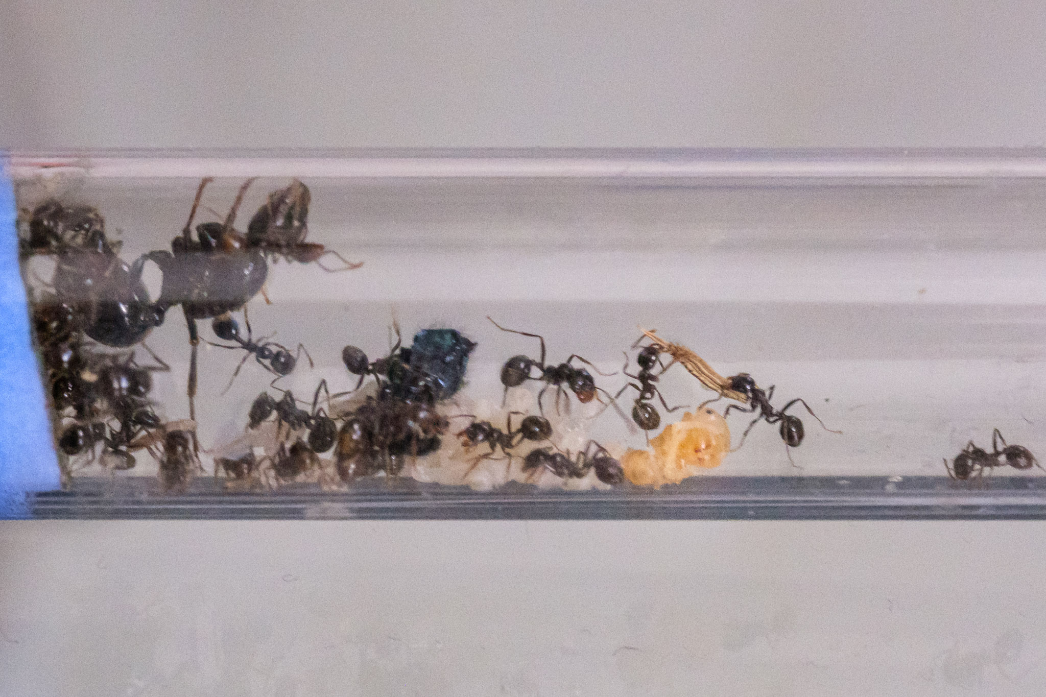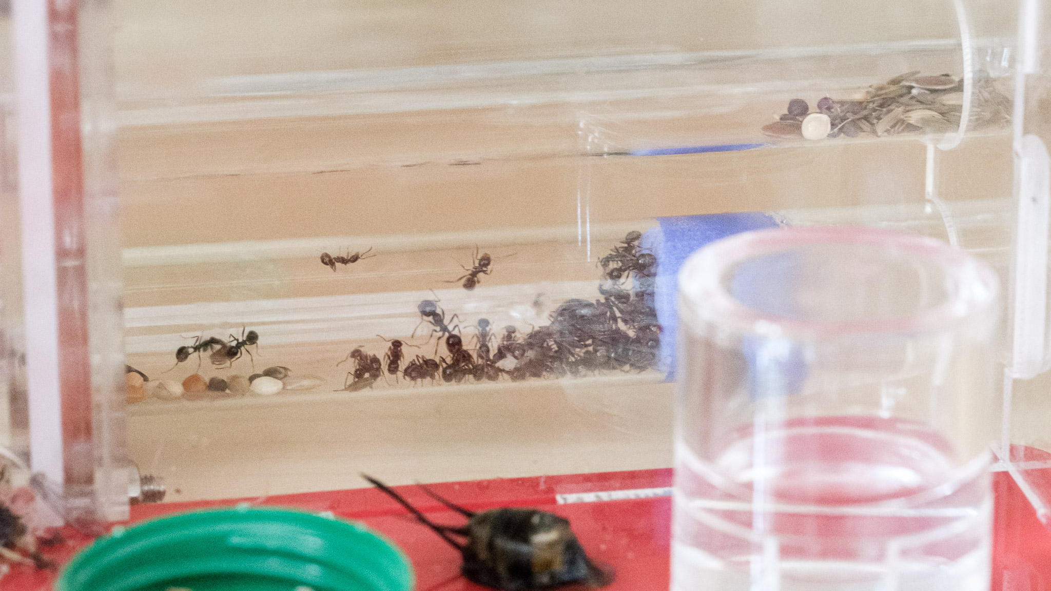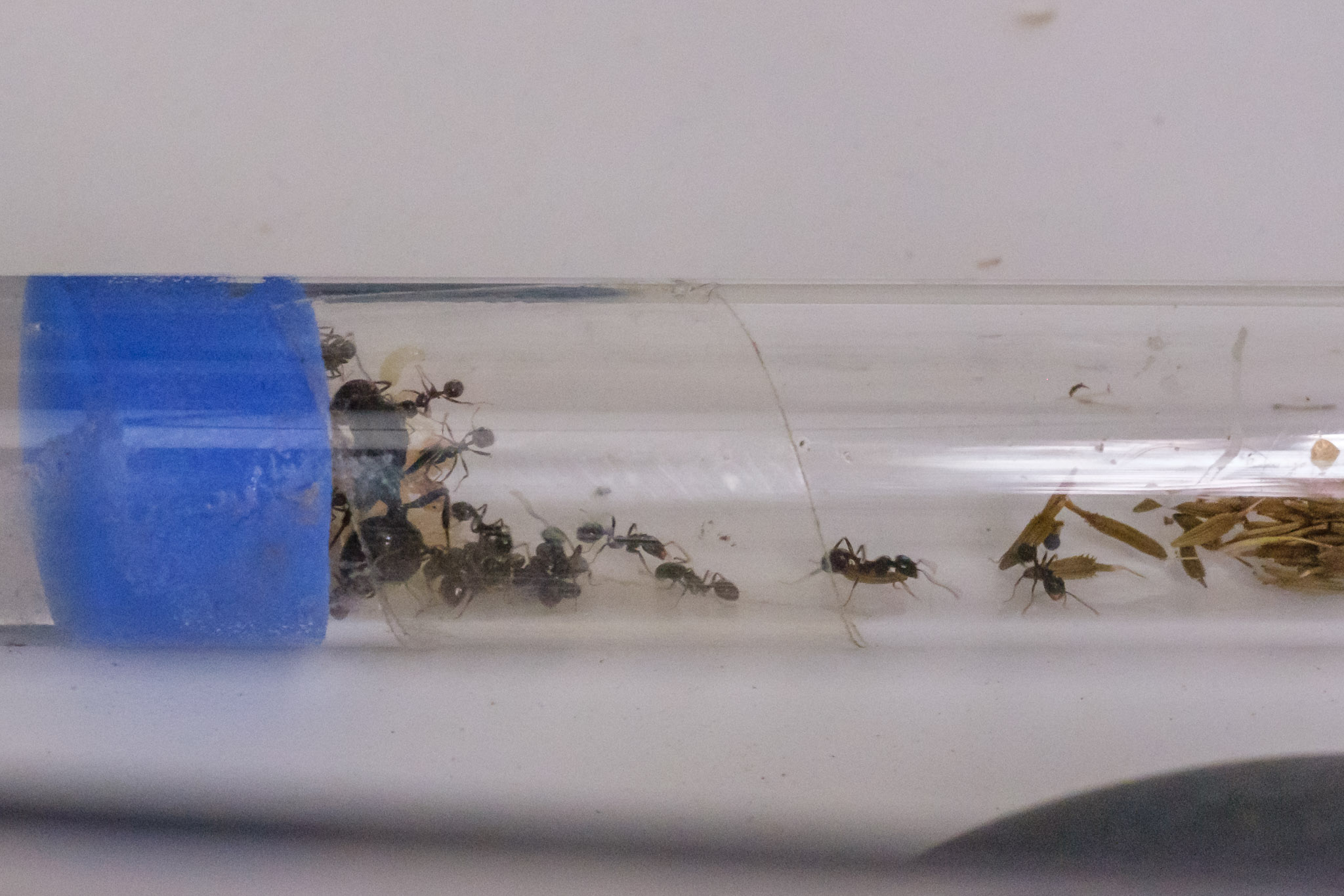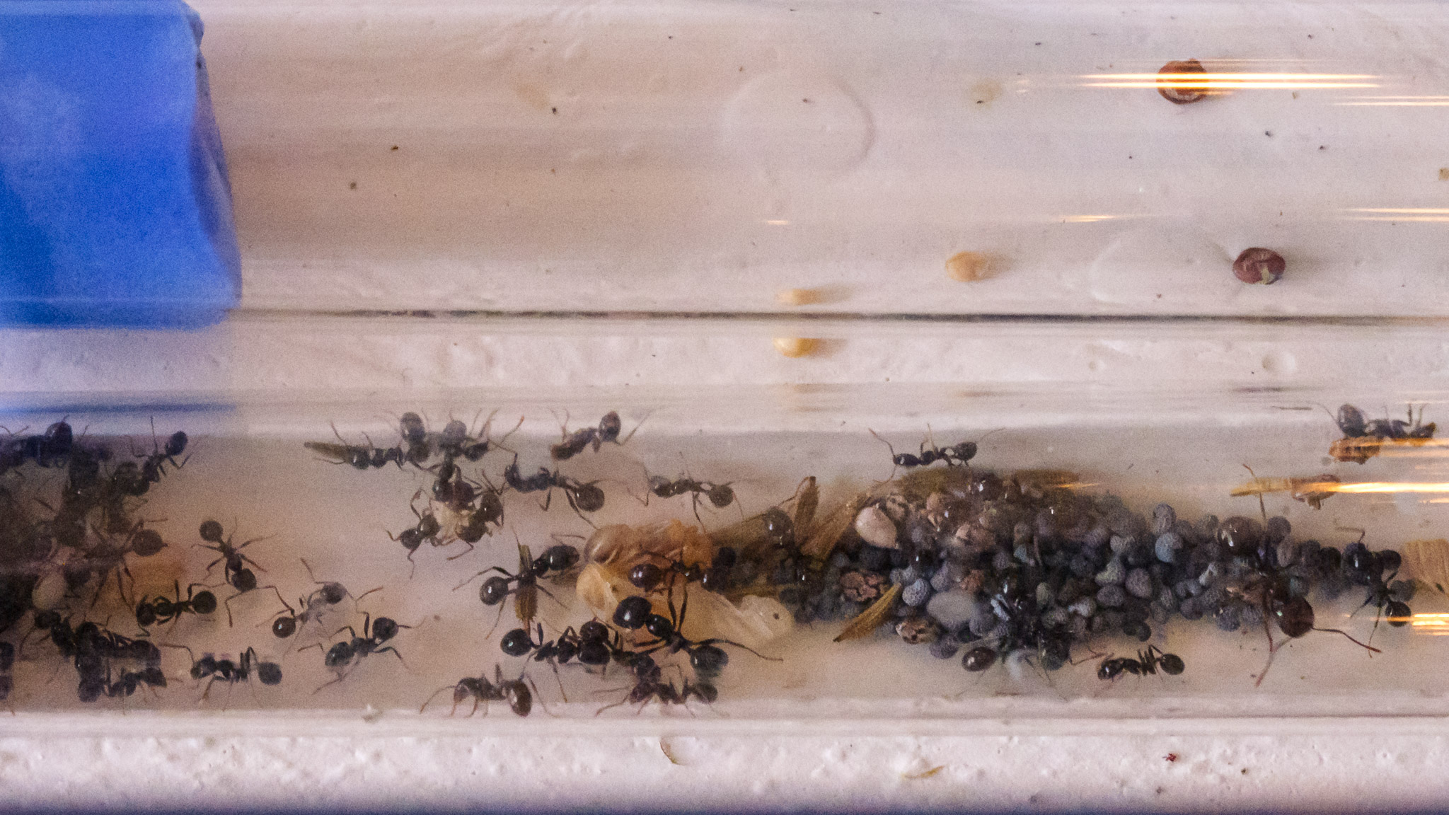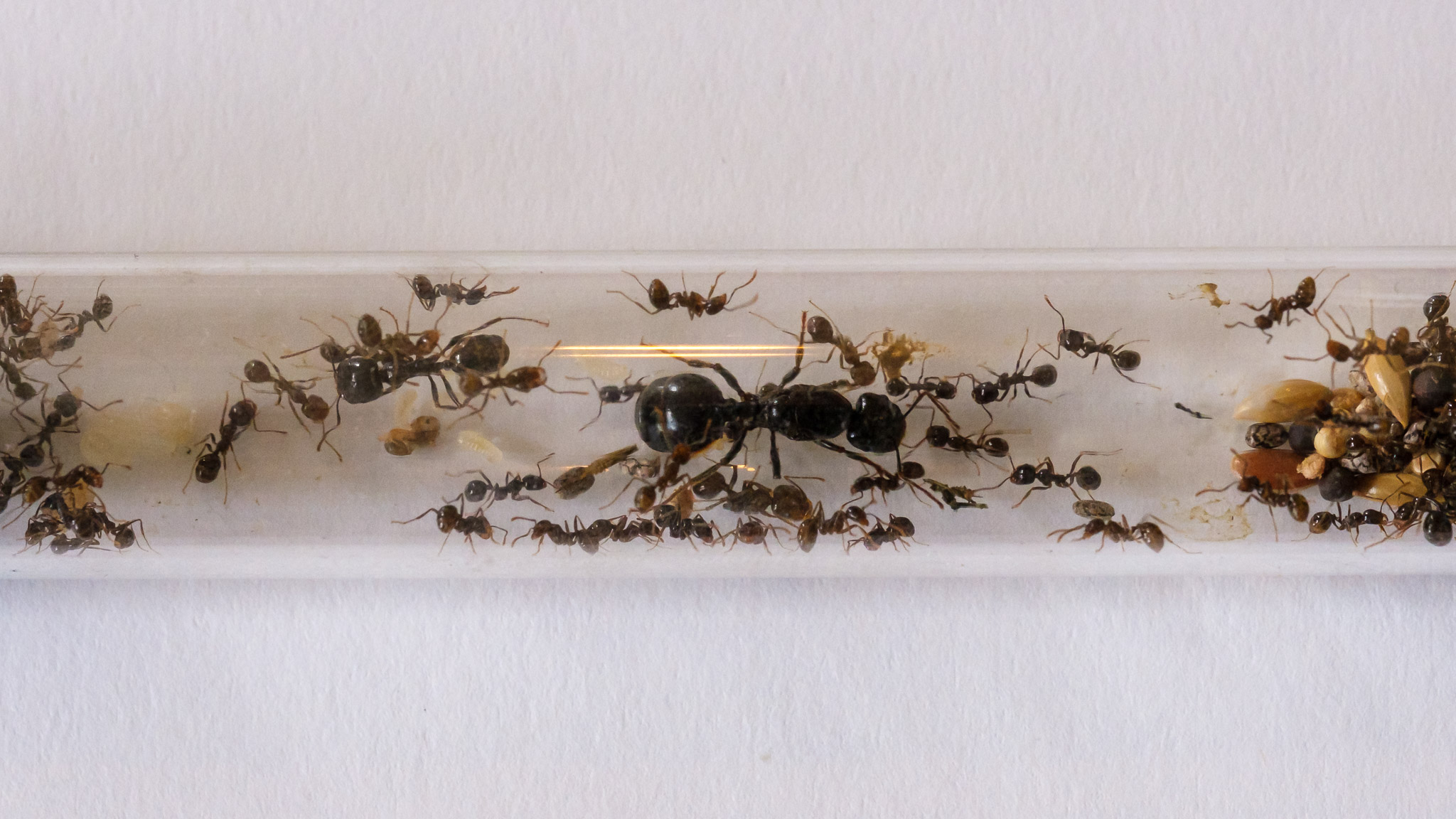 FAIL ! : la gyne ne passait pas... les ouvrières sont bien parties dans le tube du nid, mais la gyne est restée dans le tube de base. J'ai flippé qu'elle ne se fasse découper pour passer en petits morceaux... Donc méthode à la barbare : j'ai tapé le tube au-dessus de l'ADC pour que la gyne y aille. Gros stress, gros caca dans l'ADC, mais ça a fini par aller. Deux heures après, tout le monde était dans le tube, avec couvain et graines.