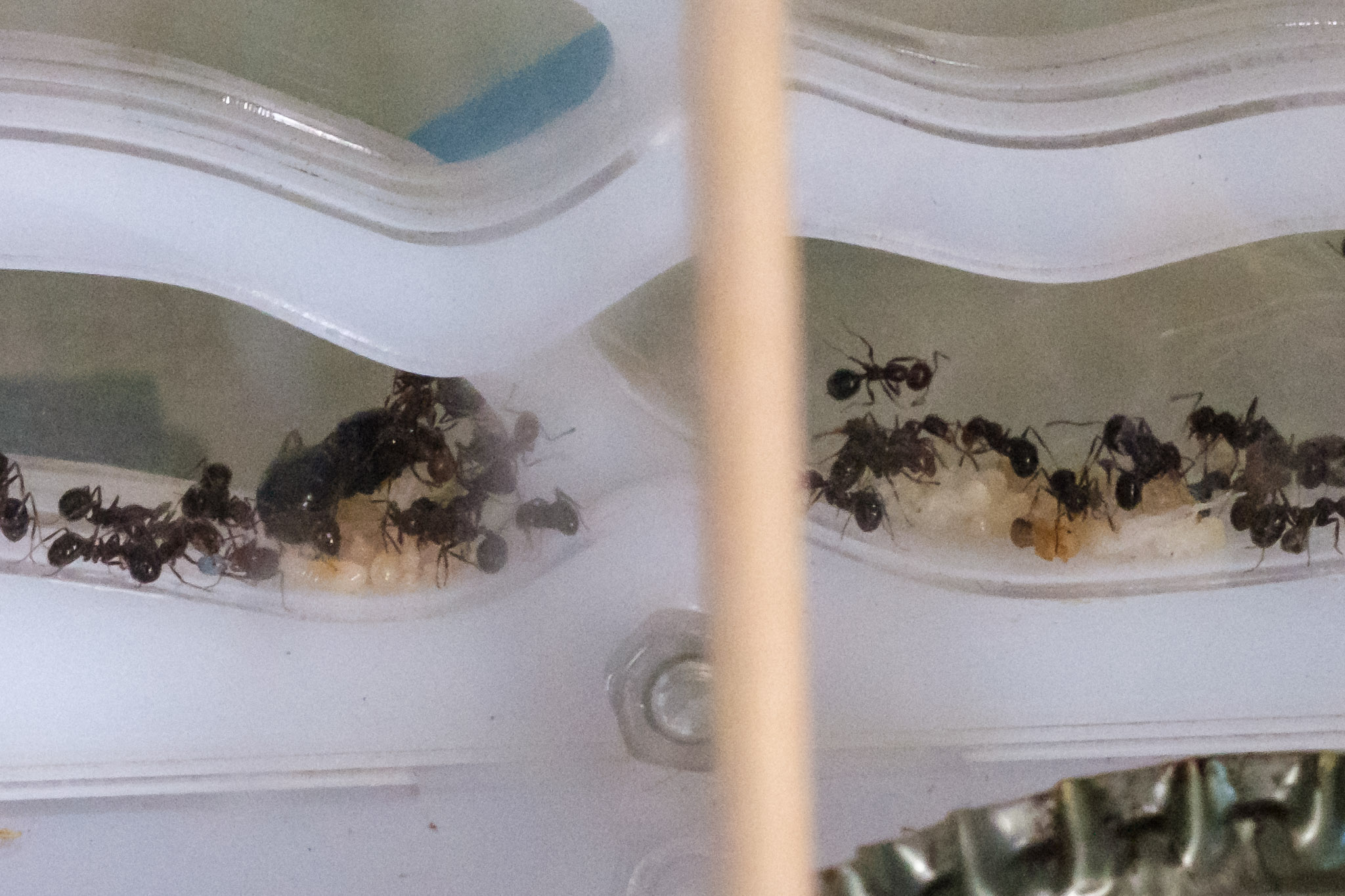 J'ai aussi fait quelques tests culinaires, toujours si ça peut servir à certain.e.s : graines de carotte : succès / anis vert : succès / carvi : succès / grillon : pas succès (elles n'ont pris que les antennes...) / grosse mouche bleue : succès / jaune d'oeuf cuit : succès absolu / viande de boeuf crue : succès absolu / vers de vase : pas succès.