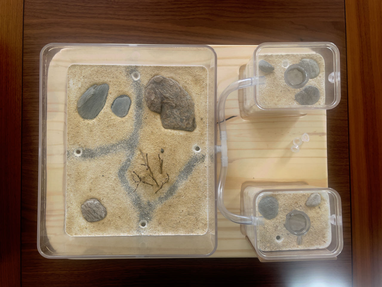 Elles sont donc arrivées le 4 mai 2020. J'ai directement connecté le tube à l'ADC du nid tube (en me disant qu'elles allaient bouger dans l'un des tubes du nid, plus humides, dont je n'avais laissé l'accès qu'à un seul tube), avec un tuyau de 6mm de diamètre intérieur.
