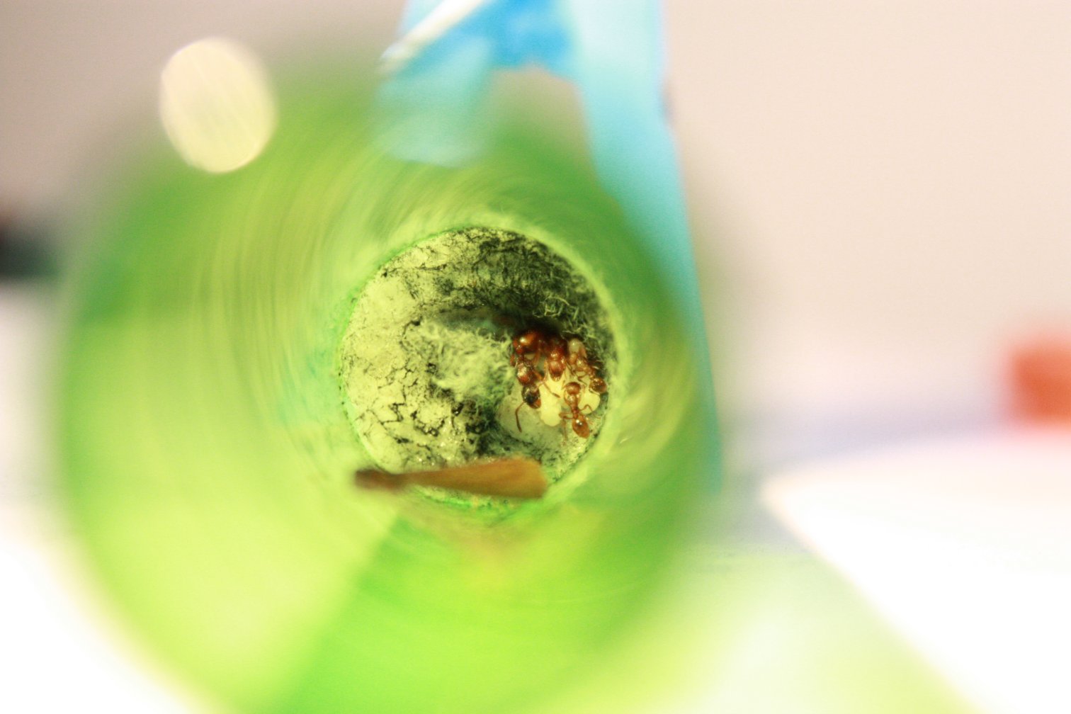 Au centre, le tuyau qui a servit de jonction entre la futur habitation et le tube d'élevage (il avait été glissé délicatement entre le coton et le bord interne de sortie du tube pour laisser aux fourmis le temps de découvrir les lieux et déménager).