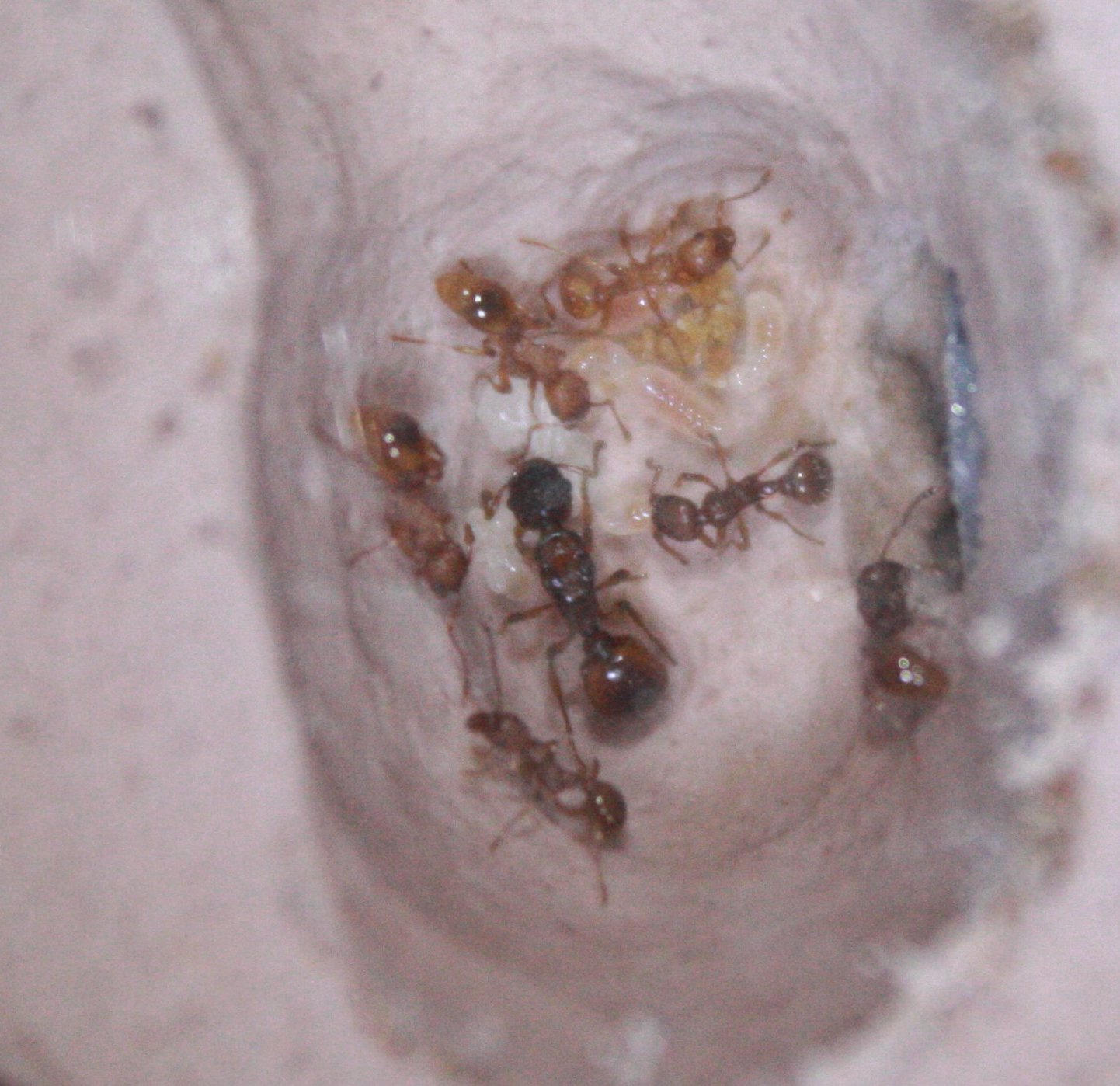 Installées dans la première chambre s'étant ramené des miettes de croquette, au nombre de 6 ouvrières et la gyne ici: