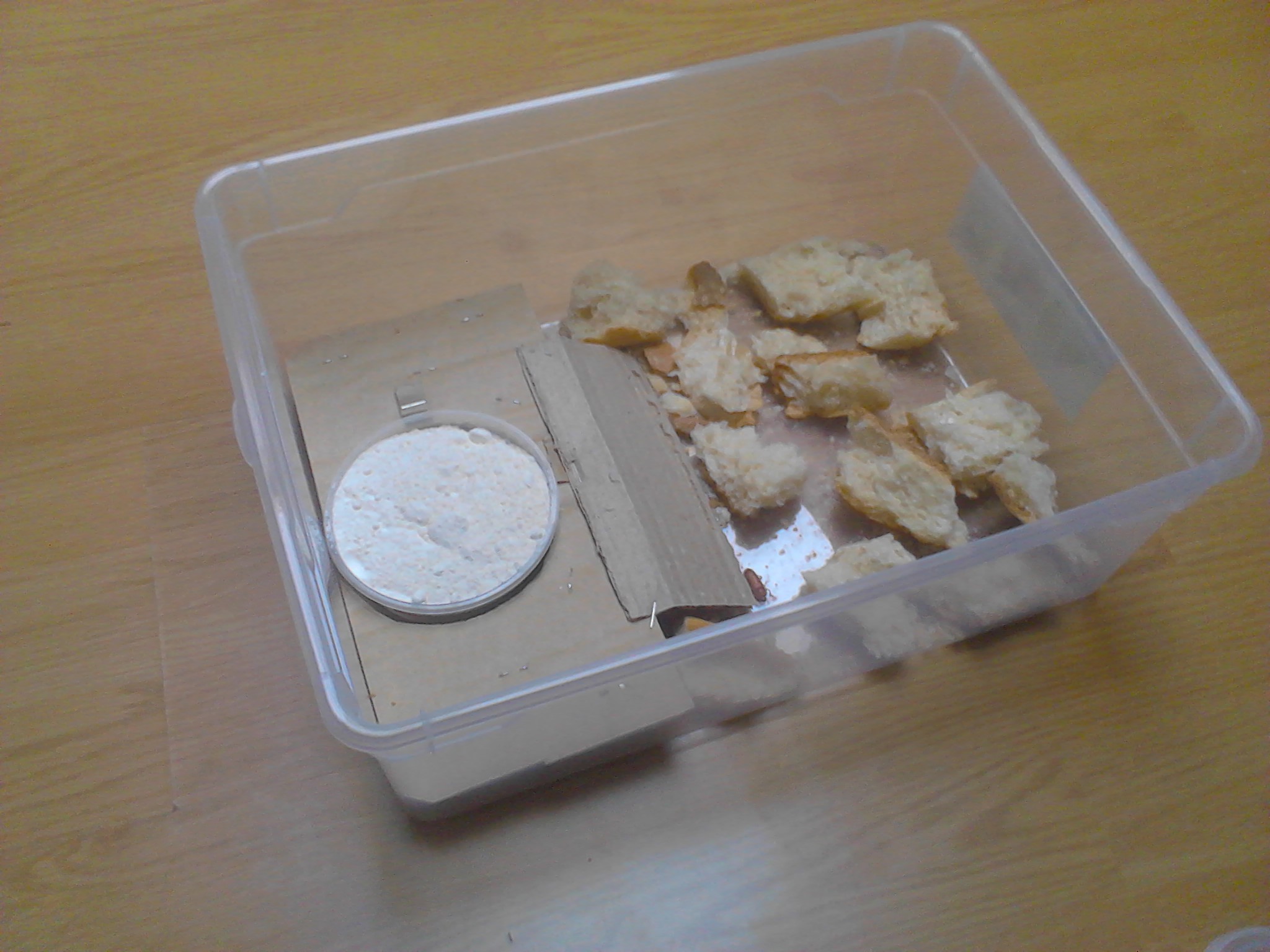 Troisième bac, même dimension que pour les vers, les ténébrions, j'ai eu mes premiers aujourd'hui, ils sont 3. Je leur ai fait un espace de ponte (récipient rempli de farine). Je ne sais pas si c'est la meilleure solution. Il faut leur mettre plein de choses dans un bac pour que quand ils se retournent ils ont un point d'appui pour se retourner. Il y a du pain, un rouleau de sopalin coupé en 2 que j'ai rajouté après.