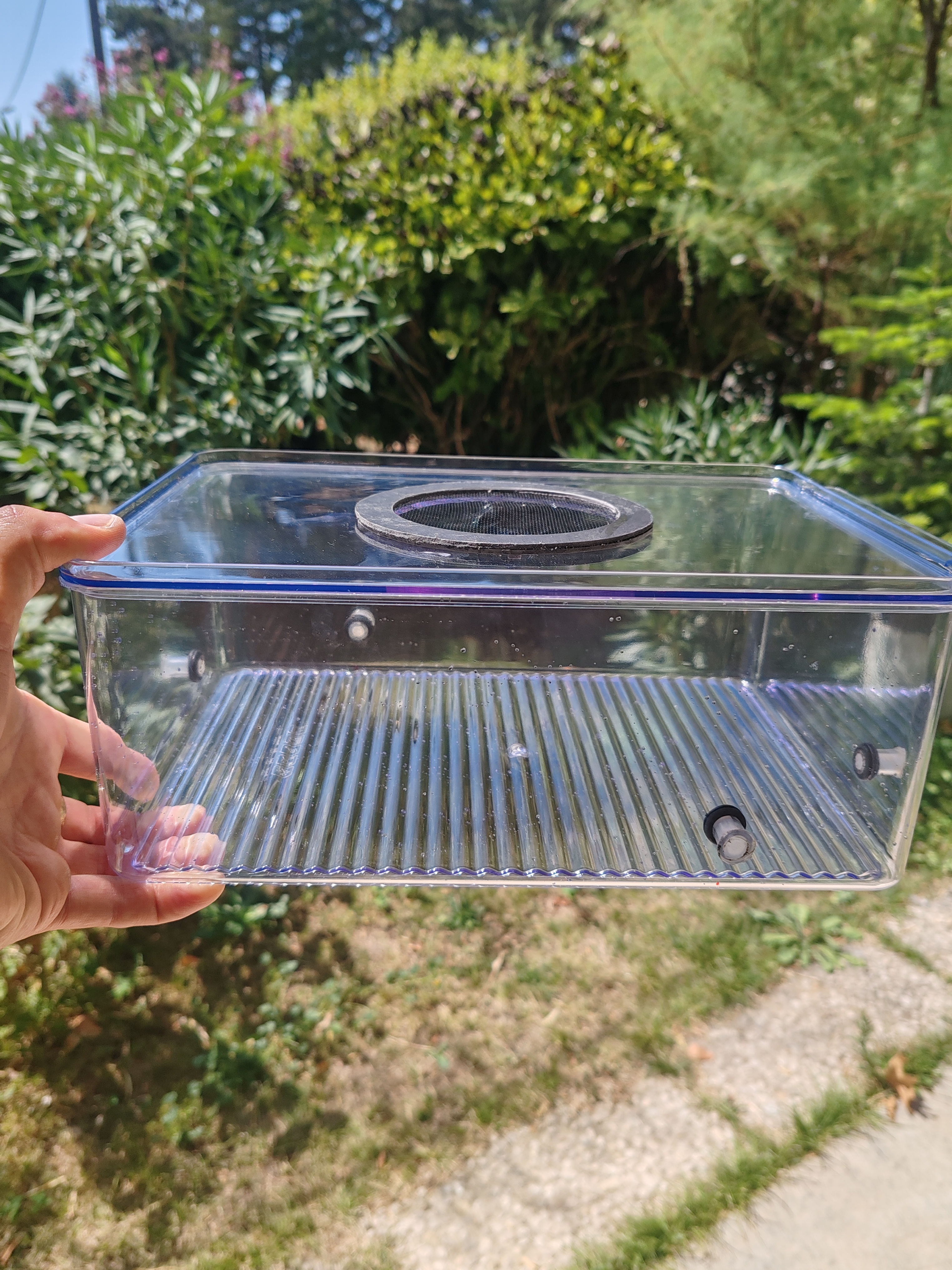 Je vais y réfléchir. C’est pour faire un petit nid car c’est une petite colonie à maturité (environ 500), donc pas de problème de poids. En fait, j’adore celui que j’ai pour mes Camponotus sanctus (placé à la verticale contre une paroi de l’ADC), mais c’est trop grand et il n’y a pas plus petit. J’avais envie de faire quelque chose dans le même style - car j’ai déjà l’ADC carré en verre qui est parfaite - mais en améliorant le système d’humidification.