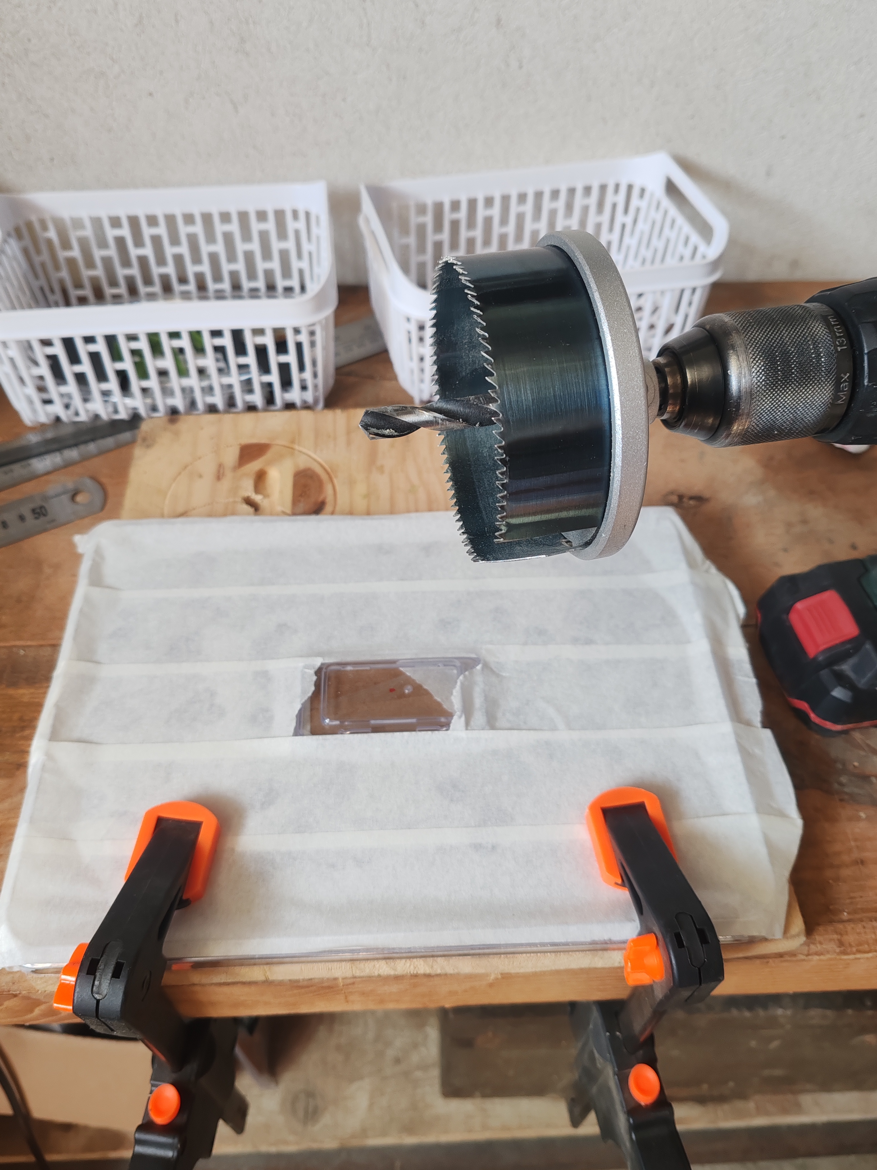 Voici ce que j'ai fait ce matin : perçage du plafond périphérique, fabrication du couvercle moustiquaire supplémentaire et de son fermoir magnétique.