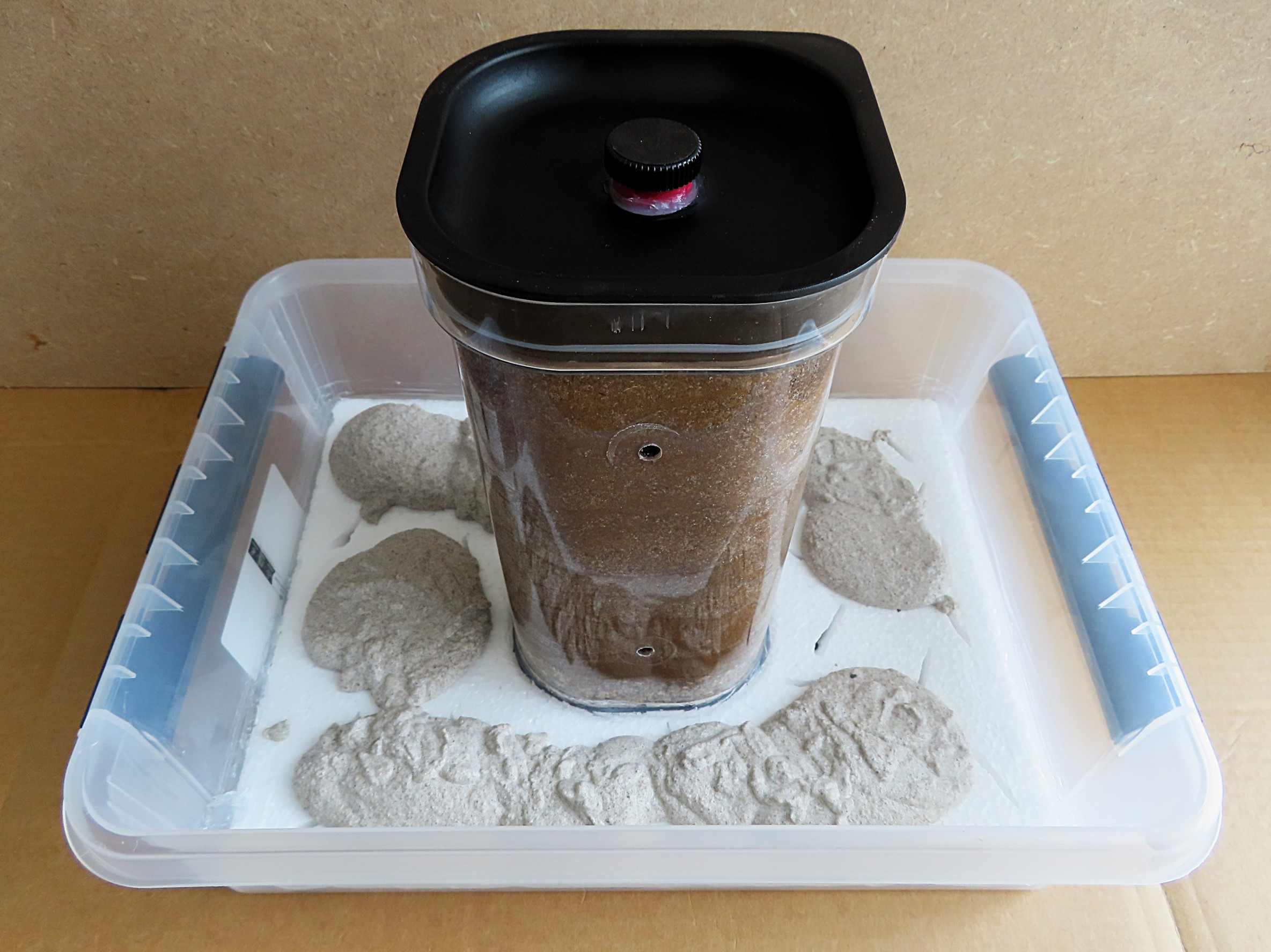 De mon côté, pour gagner en épaisseur et économiser le plâtre, je colle une plaque de polystyrène avec du joint silicone au fond de la boîte, plaque que je griffe ensuite avant de couler ma bouillie par dessus. Comme ça le plâtre une fois sec et bien cramponné ne risquera pas de se détacher.