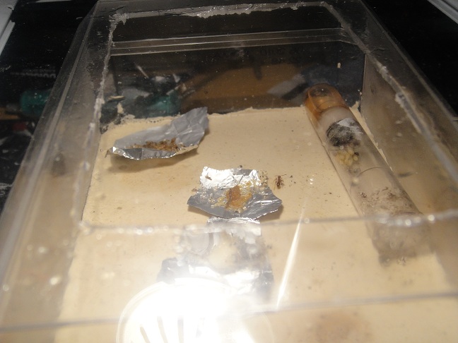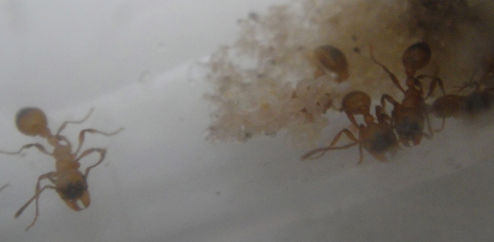 30 aout : il me reste plus qu'une nymphe, les autres étant devenues des imago. Donc la colonie est composé de 5 ouvrières, 1 nymphe qui ne va pas tarder à devenir un imago, des larves de premier stade et des œufs. Une des nymphes a disparu mystérieusement il y en avait 7 au départ.