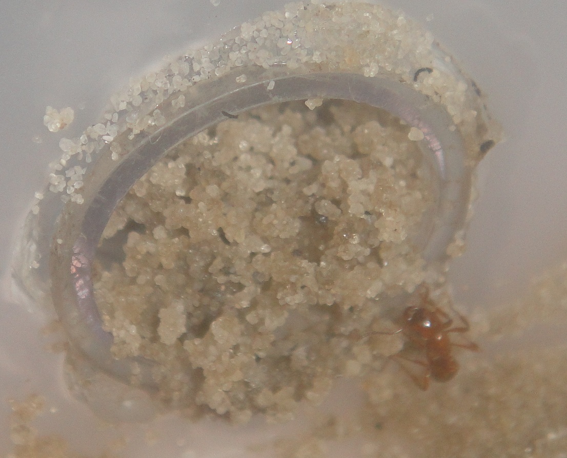 Je lui ai rajouté une petite aire de chasse. Celle-ci est fermée est devrait être que provisoire. Je l'avais laissée ouverte au départ mais je fut assez déconcerté par la facilité que la gyne avait à marcher dans la graisse rose. Sur le fond j'ai mis un peu de sable fin que j'humidifie régulièrement pour tenir une hygrométrie assez élevée. Bien sur, fallait s'y attendre la gyne s'en est servie pour boucher l'entrée du tube et laisser un passage à sa taille. Lorsqu'elle ne s'occupe pas du couvain, elle reste à l'entrée du nid, passant sa tête par l'orifice. Elle en a également mis sur une parois du tube se trouvant un peu sous la lumière de ma colonie de Myrmica sp. Enfin cela ne gène pas trop l'observation étant donné qu'il y a toujours un coté à découvert.