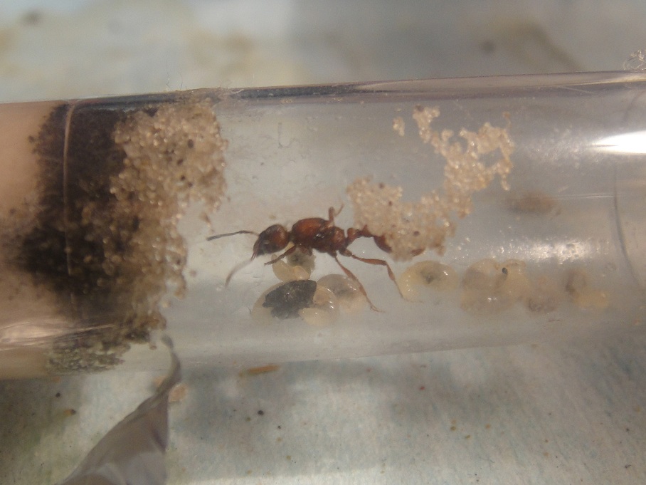 Quelques photos prises par fourmizaurus avant l’envoi. On peut y voir la gyne est son couvain composé de 9 larves.