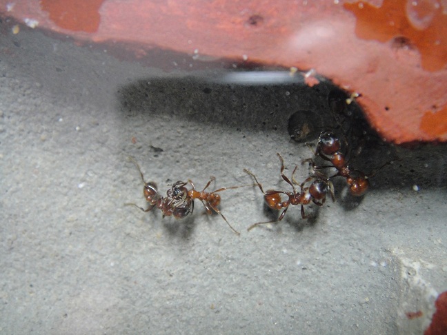 28 aout : naissance de deux ouvrières, elles sont jaunes claires et toutes mimi. Une des ouvrières s’est approchée de la fermeture du tube fait par la gyne. La gyne la rattrapé est trainé par le thorax jusqu’au couvain. Les Manica ne font pas de portage social mais du trainage social.
