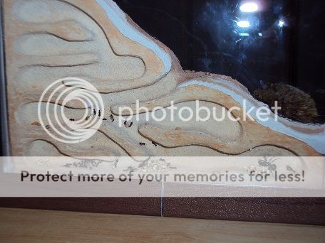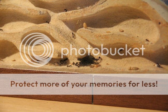 J'ai déménagé les petites hier. Je me demandais comment faire mais ça a été d'une simplicité enfantine. J'ai reçue la colonie dans un tube le mois dernier, avec une bonne réserve de graines à l'intérieur. Je ne sais pas si elles ont connu une aire de chasse ou si le tube a toujours été fermé. Quoi qu'il en soit, elles avaient l'air ravies qu'il soit enfin ouvert ! J'ai déposé le tube ouvert dans l'ADC, à l'entrée du nid. Elles ont déménagé toutes seules en moins une demi-heure o_O Elles ont ensuite emmené toutes leurs graines avec elles. Voilà les petites installées :