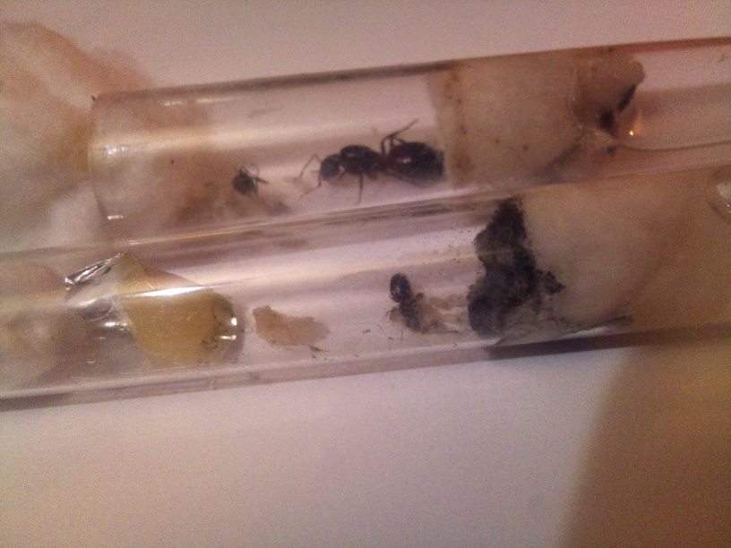 La première mesure 7 mm et est totalement noire. Elle marchait au sol et avait ses ailes mais s'est empressée de les enlever une fois mise dans le tube. Elle a ensuite commencé à pondre une belle grappe qui aujourd'hui commence à éclore.