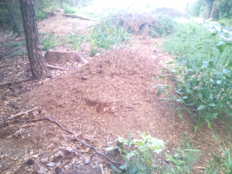 La deuxième mesure 18 mm et est noire avec quelques nuances de rouge très foncé. Il y en avait partout en l'air ou au sol, celle-ci marchait tranquillement et n'avait déjà plus d'ailes. Elle a pondu 5-6 œufs légèrement jaunes. Il reste à ce jour deux œufs (ou jeunes larves) et une belle grosse larve qui a atteint la taille des ouvrières de l'autre gyne. Dans cette forêt et comme dans toutes les autres dans les environs, d'énormes dômes sont construits ici et là. C'est de l'un d'eux qu'elle provient.