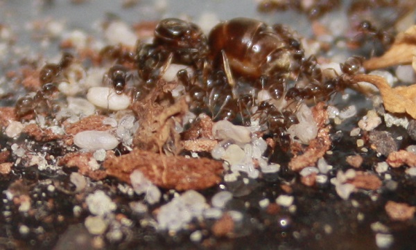 Après avoir passé un moment dans l'ex habitat planté de mes escargots de bourgogne (terreau, mousse, petites plantes, branchages etc...) où j'avais encore des cloportes, je n'ai pas trouvé qu'elle se développait, et puis 1 colonie me suffisait. Et bien sur à aucun moment des quelques mois qu'elles ont passé dans ce bac elles n'ont essayé de quitter leur tube pour établir une vraie fourmilière. Alors j'ai décidé de les relâcher dehors (j'avais récupéré les gynes dans mon jardin lors d'un essaimage, je me suis dit qu'elle ne serait pas dépaysée). J'ai donc pris le tube et je l'ai déposé d'un un coin tranquille de mon jardin, un peu incliné pour que l'eau ne rentre pas dedans, un peu caché sous une plante : au revoir les fourmis ! C'était en juillet.