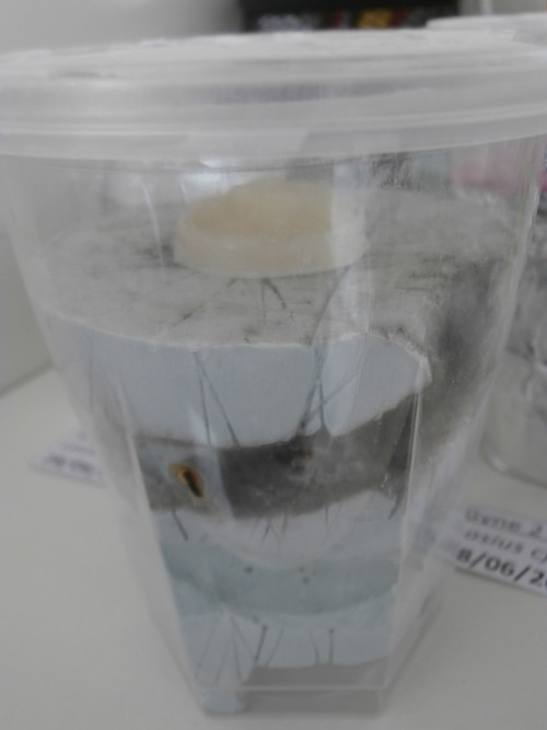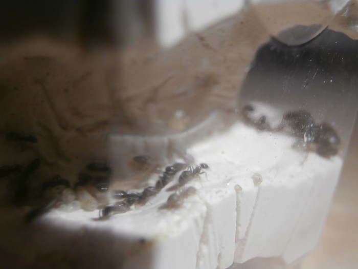 Le 25 septembre j'ai fabriqué des nids en plâtre pour mes colonies de Lasius cf niger. J'ai laissé 1 journée sécher, et je les ai installées donc le 26. Comme ce sont des lasius, elles ont mis une bonne semaine à s'installer (gyne, couvains, ouvrières ensemble). Et depuis peu, ça commence tout doucement à pourrir. ^^