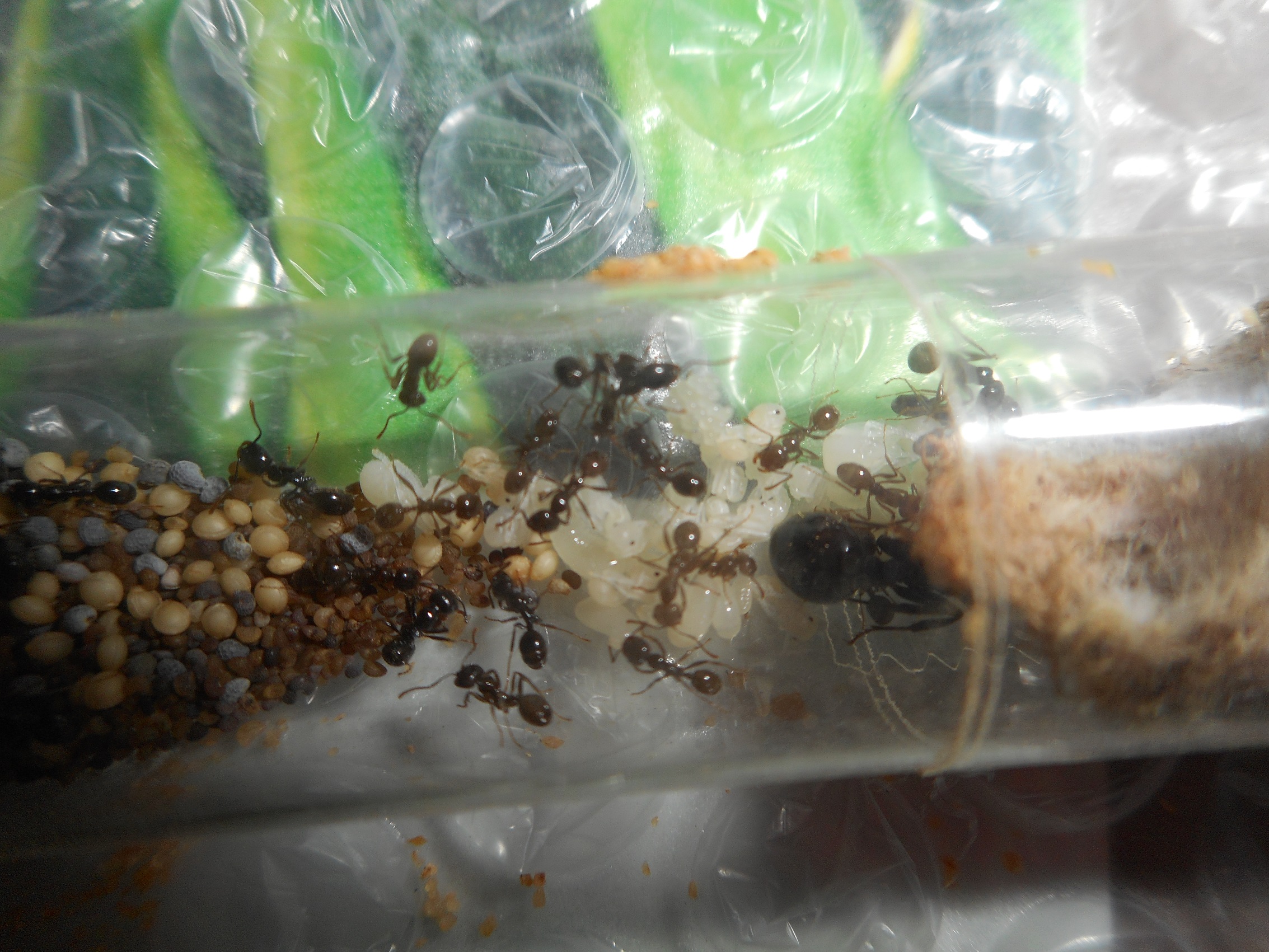 L'ADC n'a pas beaucoup bougé, les ouvrières s'occupent à faire des voyages entre le lieu des graines, le tube rempli d'eau, et les quelques protéines (fruits ou insectes) que je peux déposer. Il y en a toujours 3-5 ouvrières qui circulent. Une petite plaque de carton a été déposée pour ne pas que les fruits/viandes/insectes soient recouverts de sable.