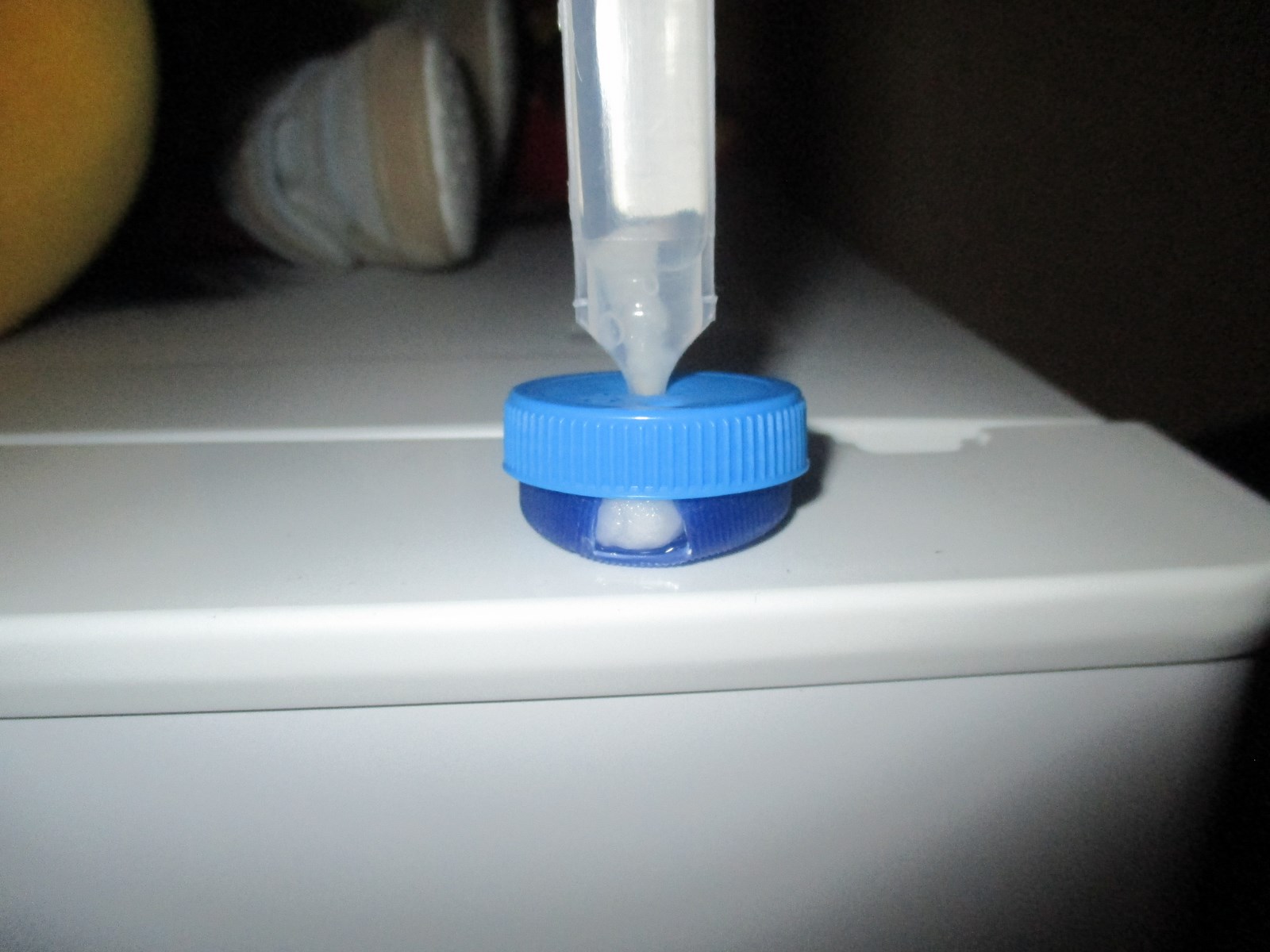 On referme le tout et on remplit le bouchon avec la seringue en se servant du deuxième trou libre.