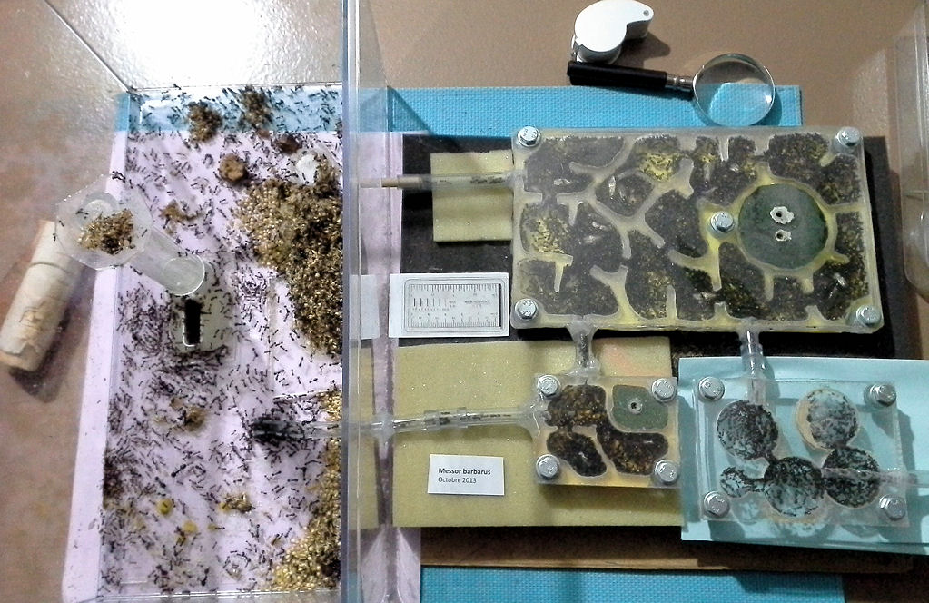 Les Messor barbarus (octobre 2013) qui sont pratiquement toujours actives même en diapause, envahissent énormément l'aire de chasse et y laissent leur grenier. Je vais leur faire un autre grand module pour voir…