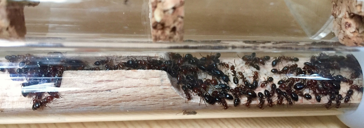 Quelques fourmis se sont réfugiées avec une petite partie du couvain dans le tube « humide », mais la majorité d'entre-elles est installée dans le tube où se trouve la gyne.