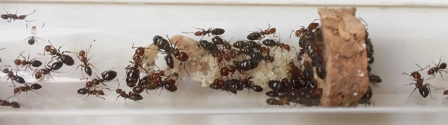 J'ajoute que les fourmis semblaient très demandeuses d'aliments à base de viande, et elles le sont toujours d'ailleurs.