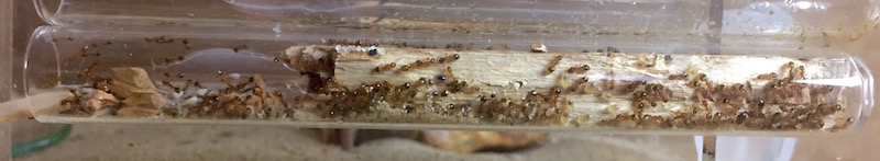 La gyne, quelques dévouées ouvrières, et le couvain sont toujours regroupés près de la mousse humide du tube.