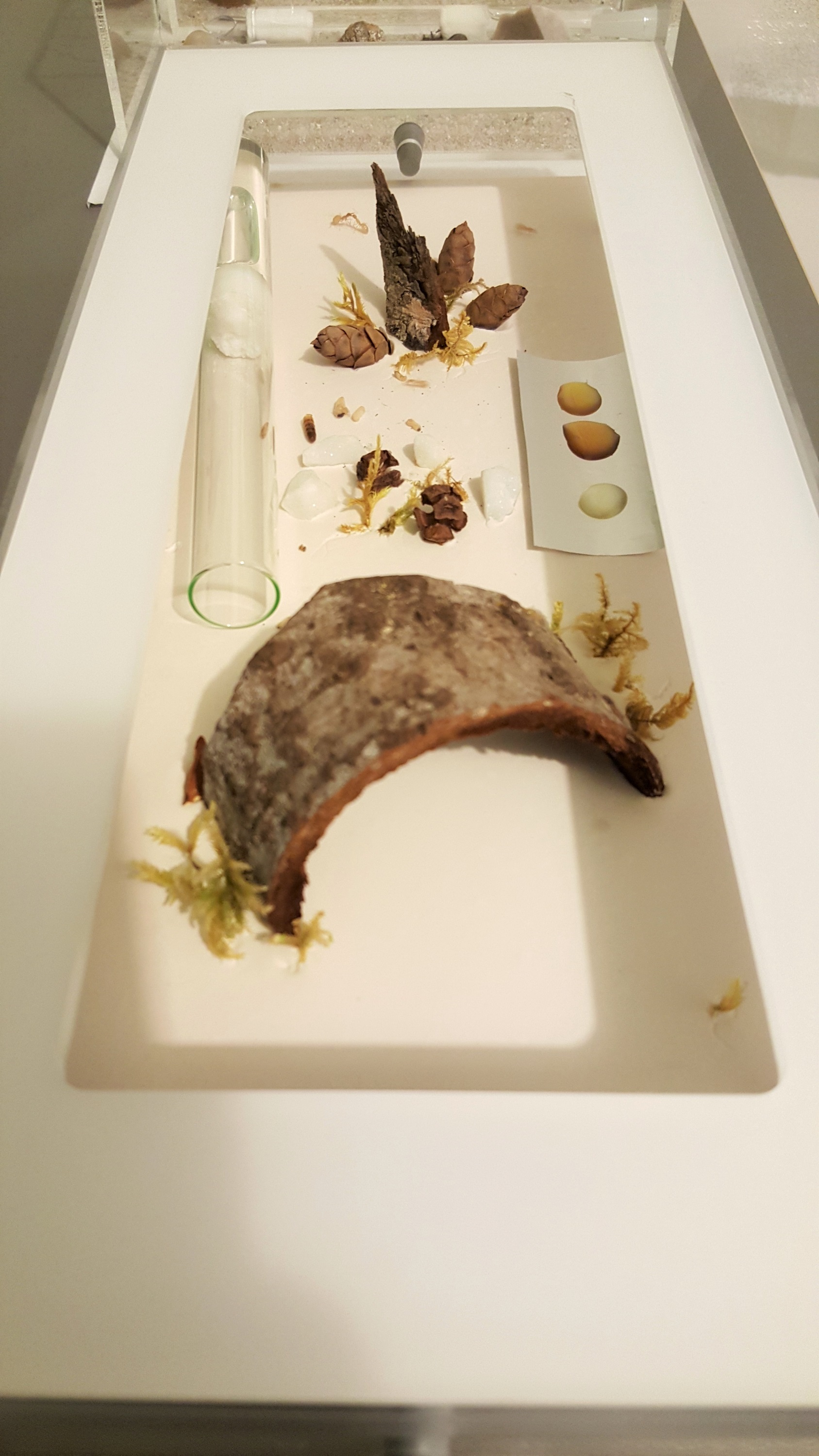 L'environnement de vie, composé d'une ADC ouverte de 35 cm sur 15 cm, avec quelques décors naturels et un grand tube à essai posé dedans :