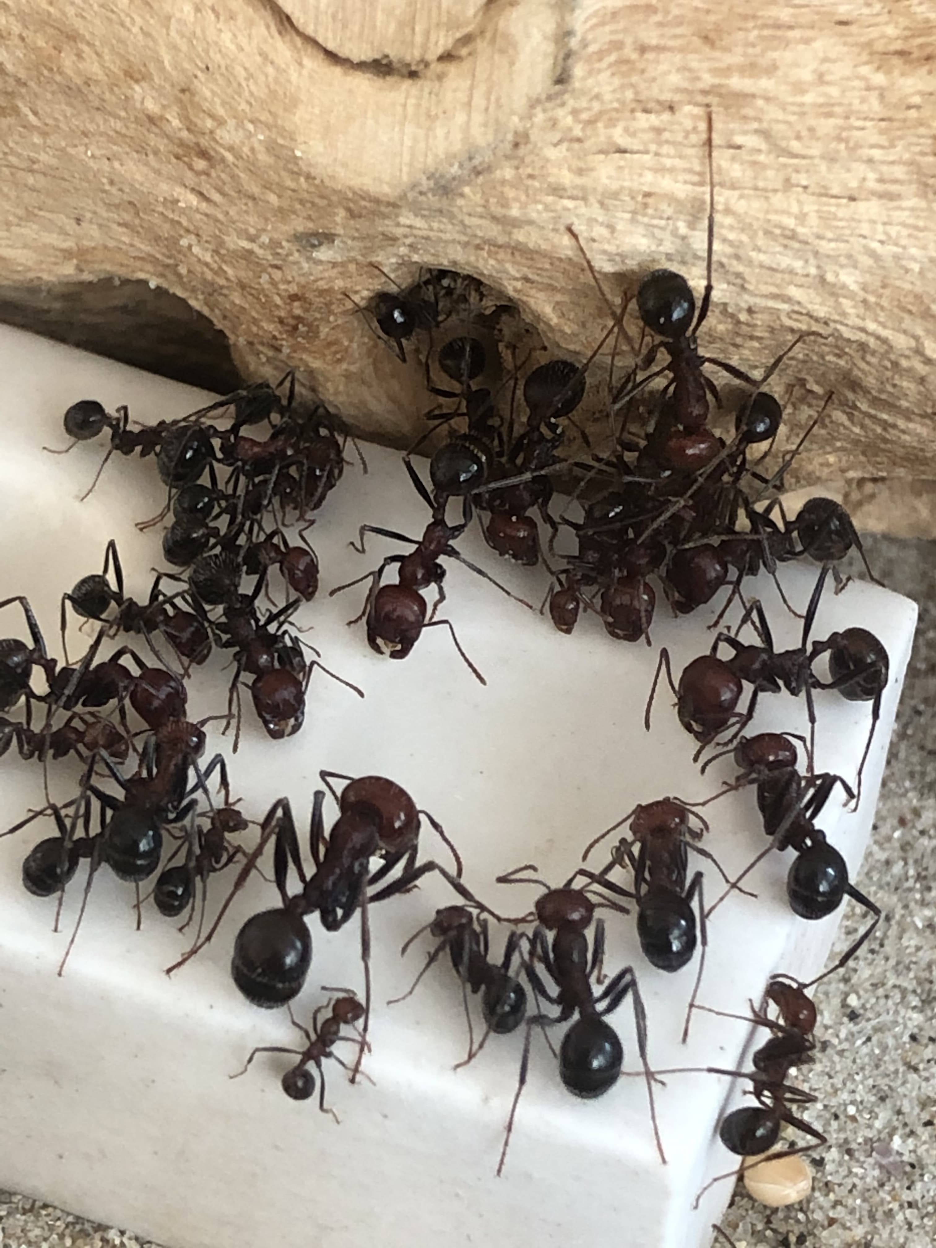 - Lors d'un contrôle de la population de mes différentes colonies, j'ai pu m'approcher directement de mes Messor cephalotes avec tranquillité car figurez-vous, à l'instar des Messor barbarus carrement peureuses, celles-ci sont voraces, elles sont braves et surtout elles ne fuient pas lors d'une quelconque vibration ! Quel bonheur !
