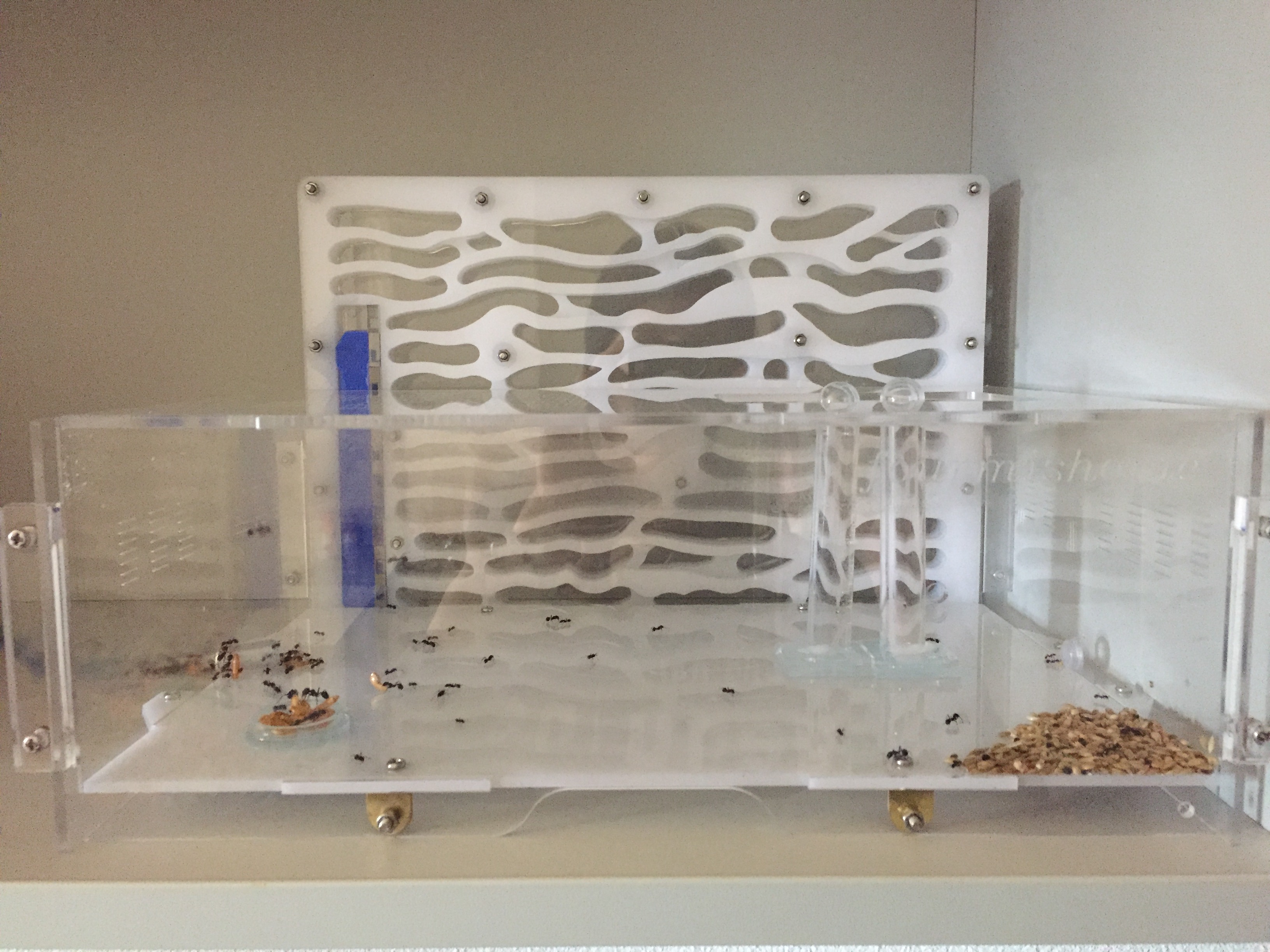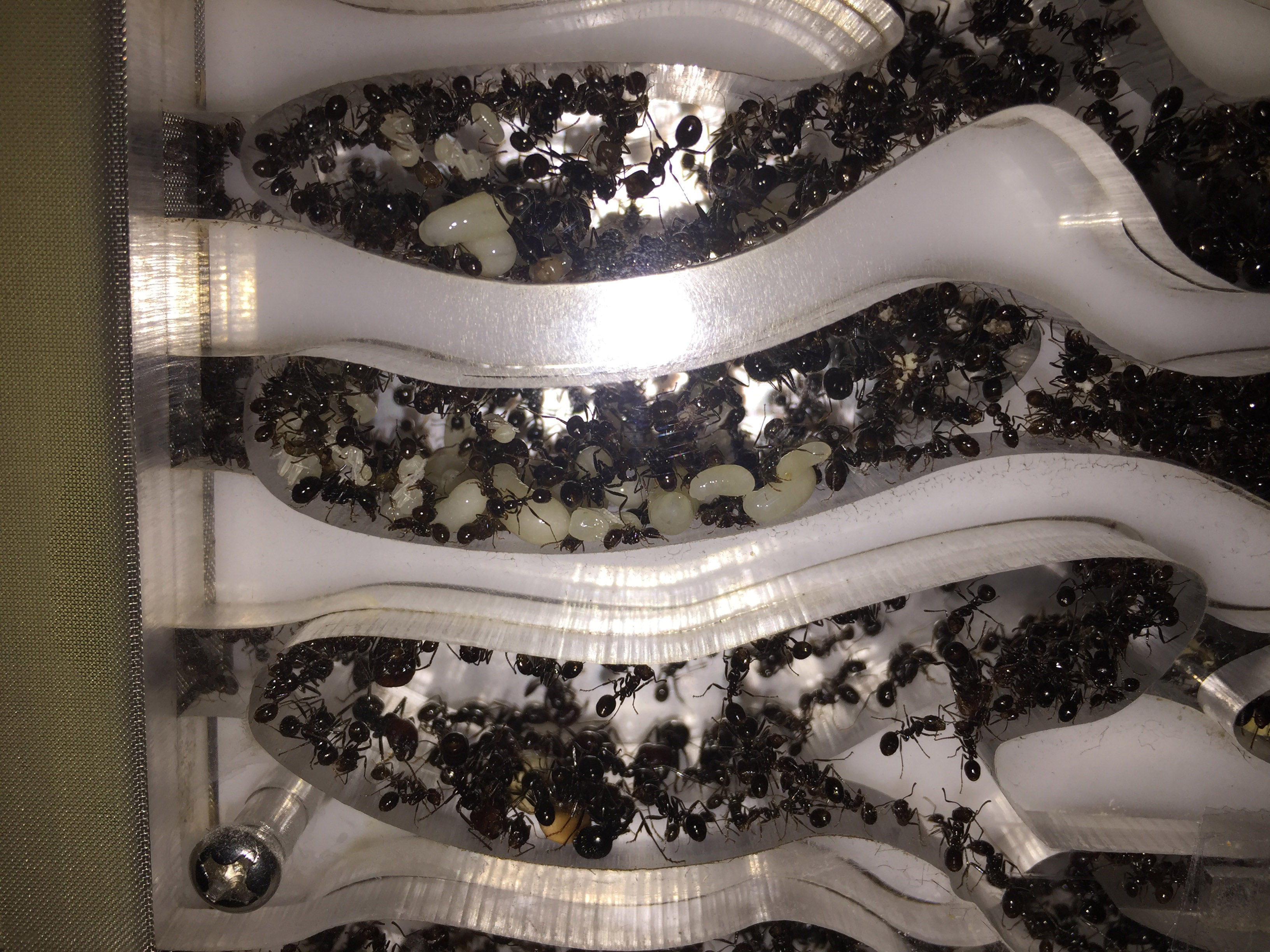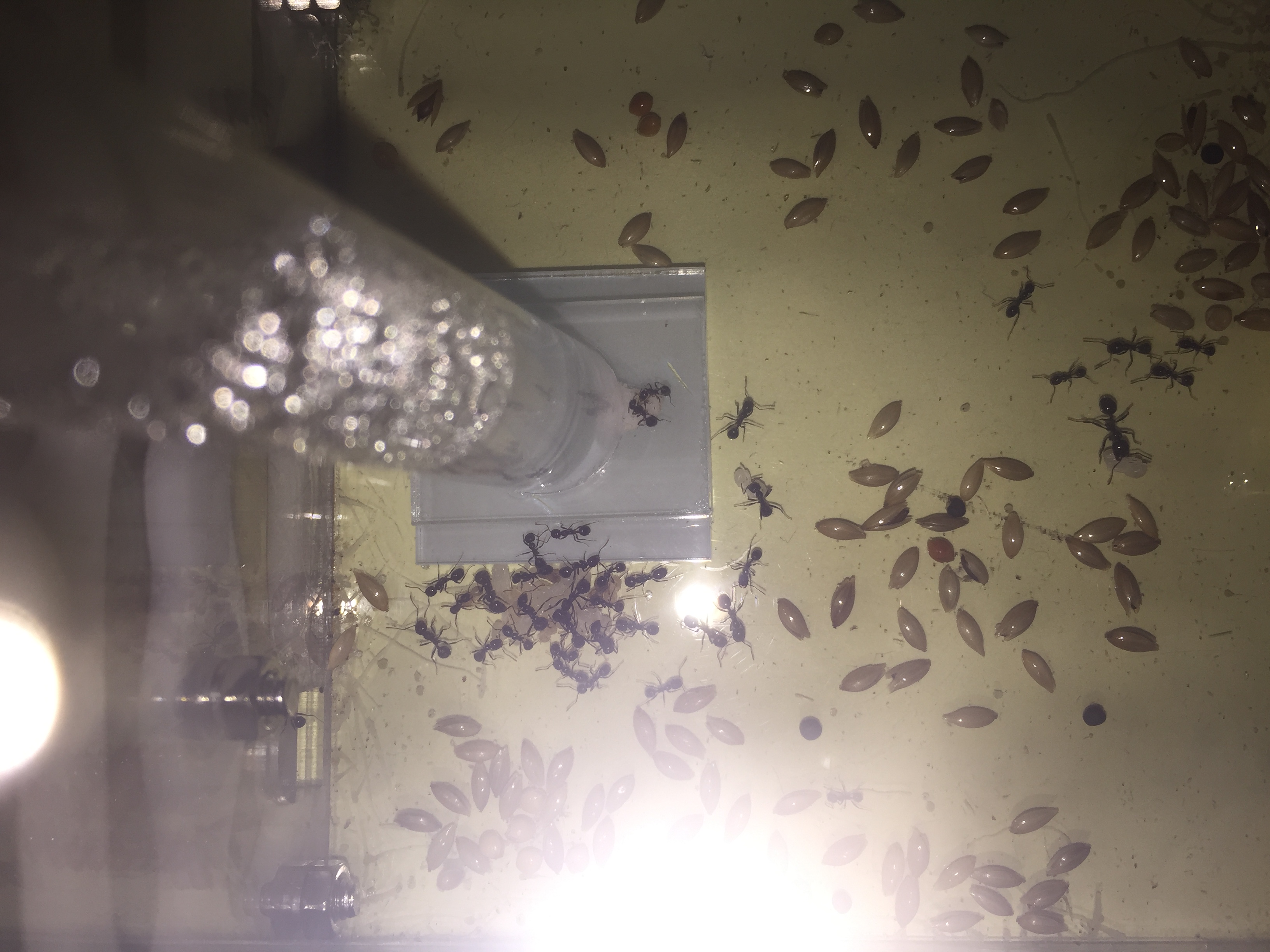 Quelques jours plus tard j'ai humidifié le nouveau nid comme je fais d'habitude, je prends une seringue et je vide la seringue directement dans la mousse bleu par le haut. J'ai pris l'habitude depuis mon ancien nid d'arrêter l'humidification dès lors que l'eau sorte par cette fameuse sortie de surplus d'eau ce qui voudra dire que la mousse est totalement humidifiée. Vous connaissez la suite... la sortie étant bouchée l'eau s'est accumulée directement dans les salles du nid. J'ai mis du temps à m'apercevoir de ma boulette, les premières salles étaient remplis au 3/4. J'ai du incliner le nid à 90 °C pour faire sortir l'eau. Bilan : au moins une centaine de fourmis piégées dans l'eau mais heureusement la majorité a survécu.