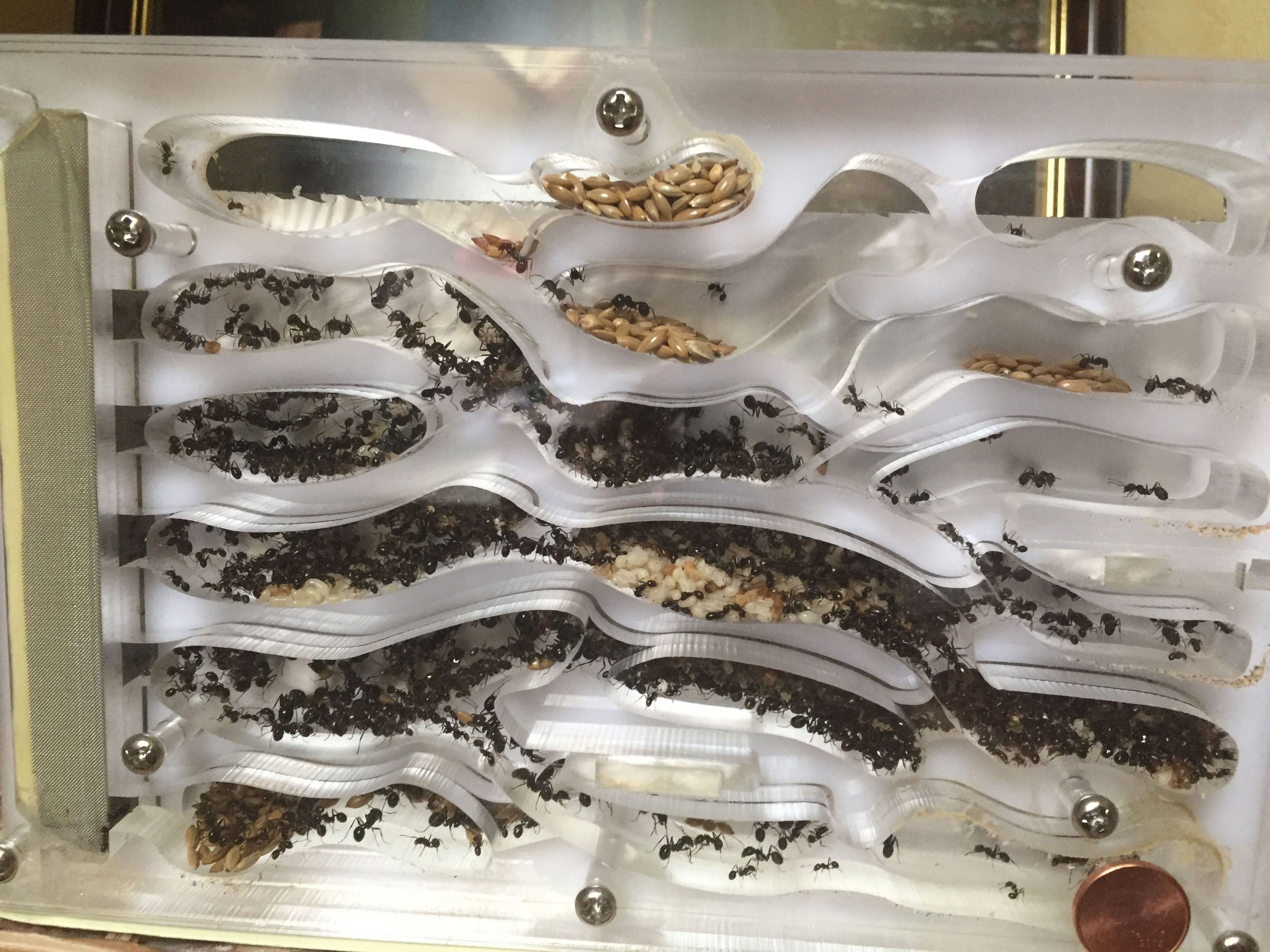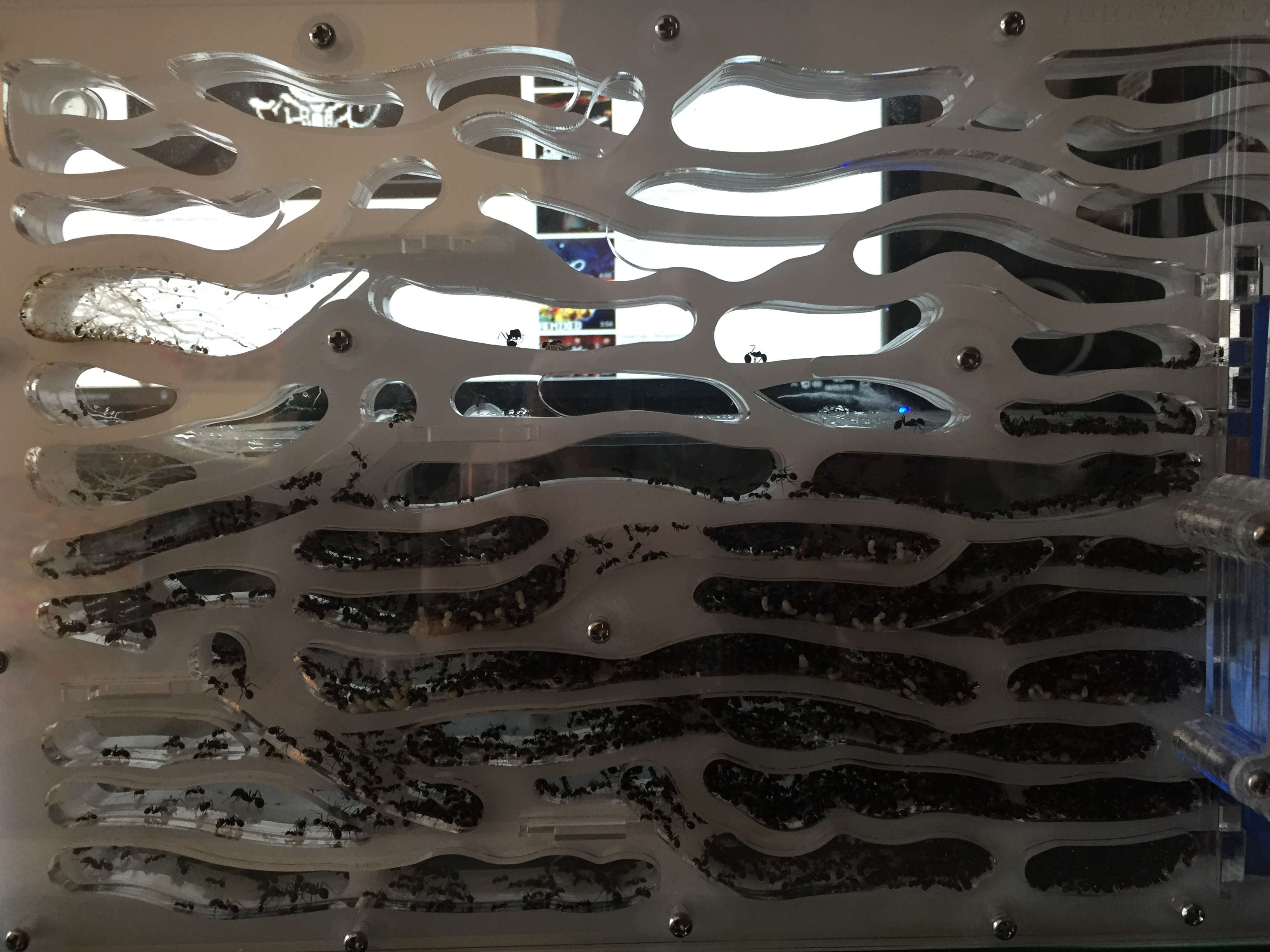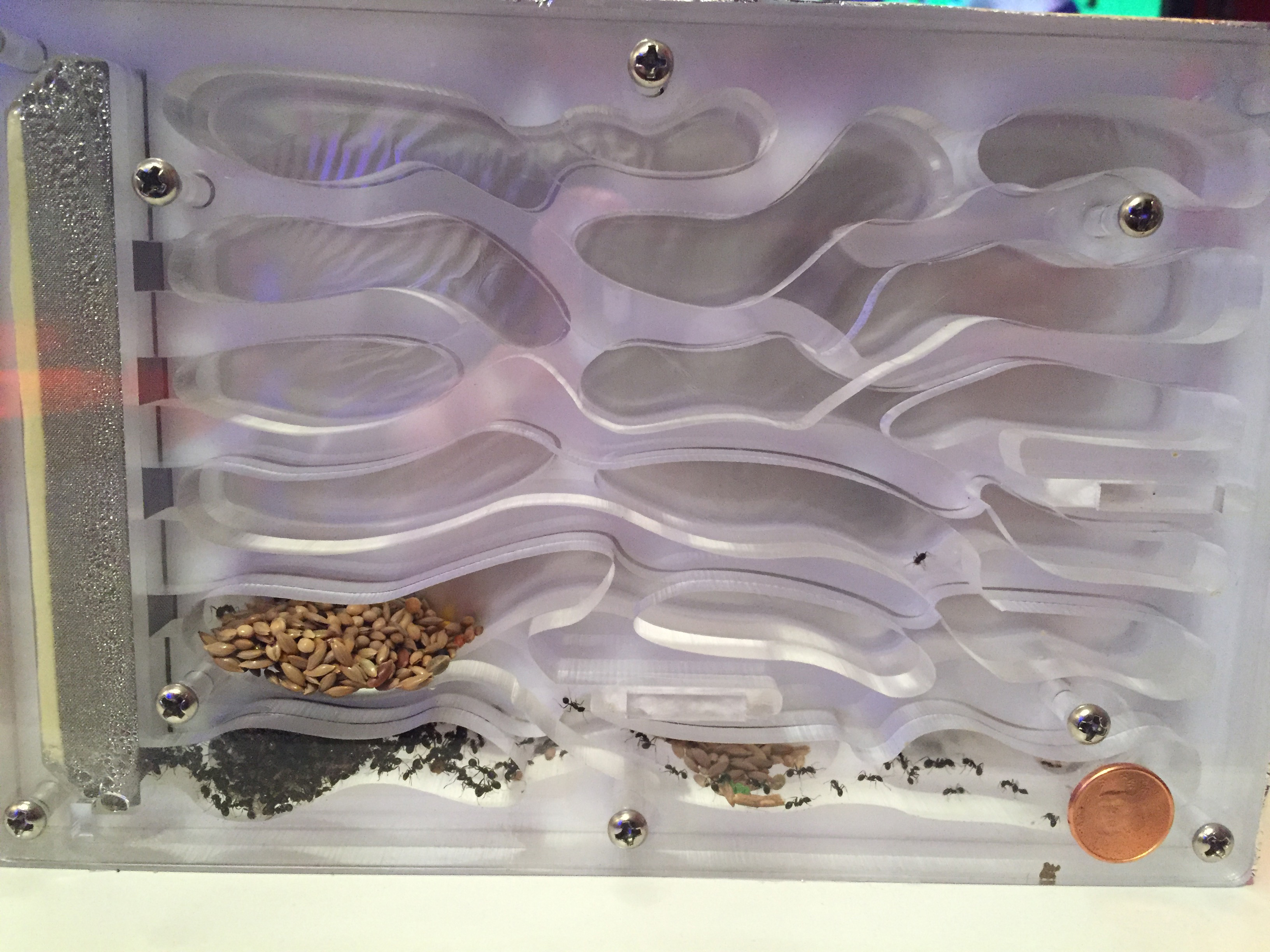 Quelques jours plus tard j'ai humidifié le nouveau nid comme je fais d'habitude, je prends une seringue et je vide la seringue directement dans la mousse bleu par le haut. J'ai pris l'habitude depuis mon ancien nid d'arrêter l'humidification dès lors que l'eau sorte par cette fameuse sortie de surplus d'eau ce qui voudra dire que la mousse est totalement humidifiée. Vous connaissez la suite... la sortie étant bouchée l'eau s'est accumulée directement dans les salles du nid. J'ai mis du temps à m'apercevoir de ma boulette, les premières salles étaient remplis au 3/4. J'ai du incliner le nid à 90 °C pour faire sortir l'eau. Bilan : au moins une centaine de fourmis piégées dans l'eau mais heureusement la majorité a survécu.