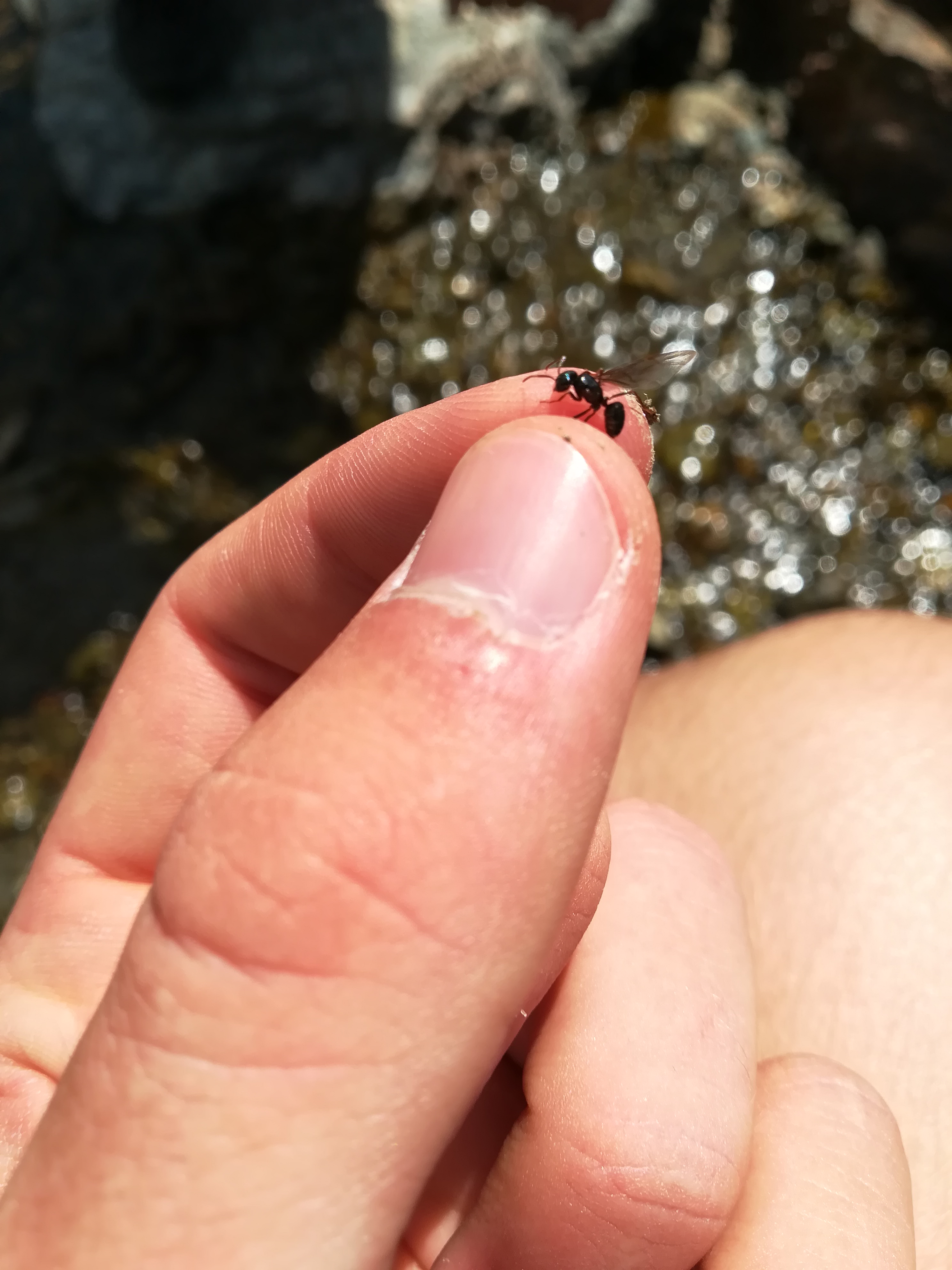 Bon, j'ai récupéré cette reine ailée car je n'ai pas su du tout déterminer l'espèce... Elle se baladait seule, à côté d'un cours d'eau à 2 500 m d'altitude, vers 16h30. Il y a avait un beau soleil. Elle mesure 5 mm environ. Voici la bête :