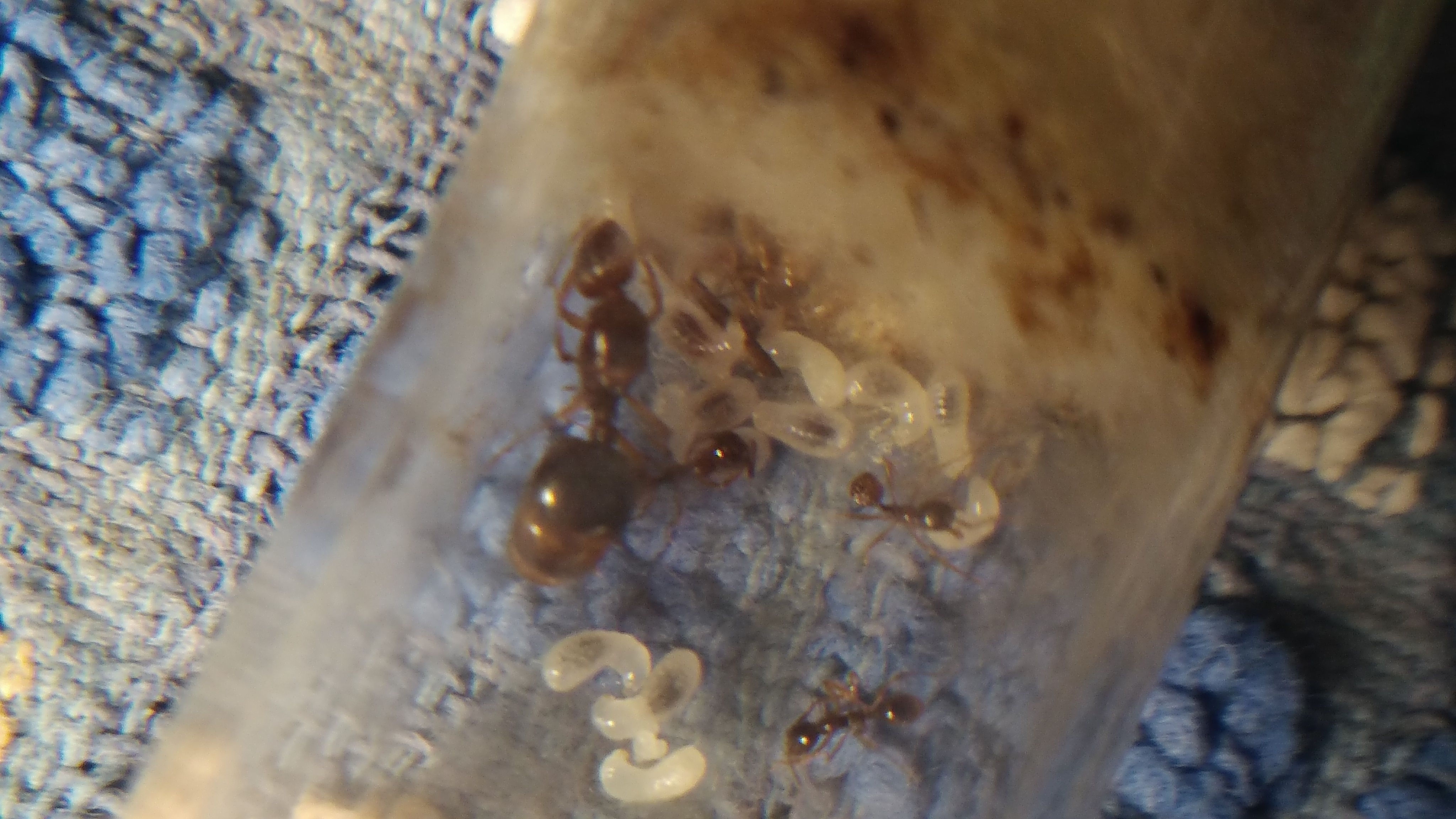 Bonjour, aujourd'hui je vais faire un suivi rapide de ma fondation d'Aphaenogaster subterranea. Je n'ai donc qu'une petite nouvelle à vous annoncer mais pas des moindres : la gyne a re-pondu, il y a environ 5 à 8 œufs et les ouvrières sont toutes folles.