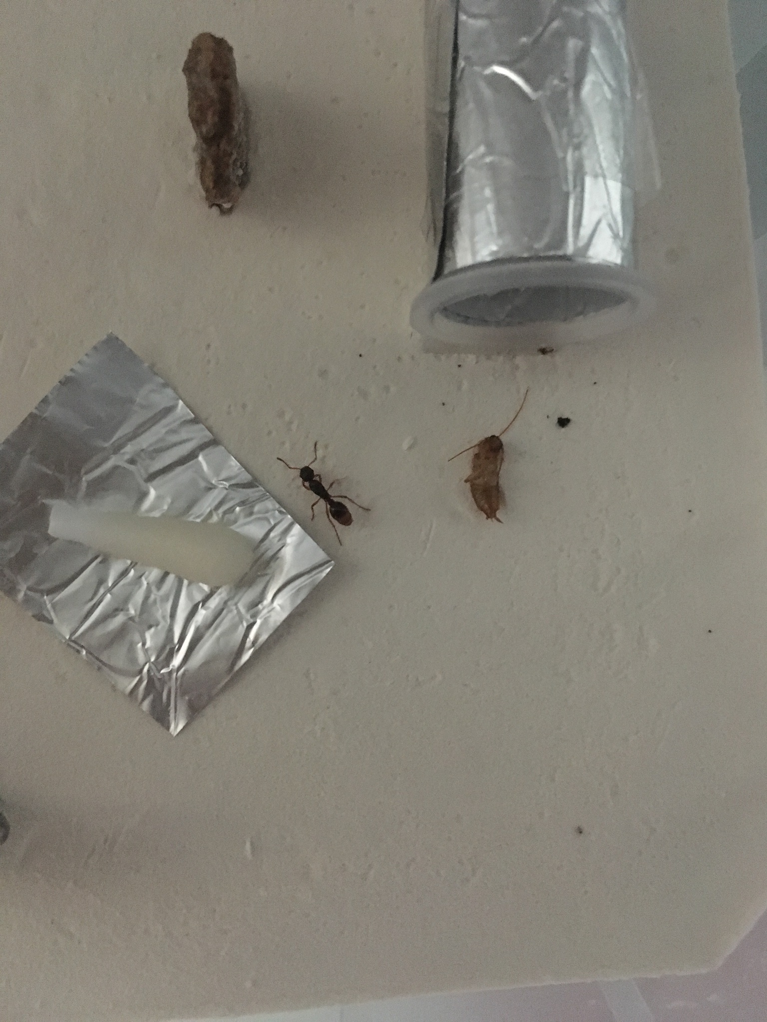 j’ai ramassé cette gyne dans une fontaine cet été au Portugal. Elle mesure 6-7 mm et est de couleur foncée avec des rayures plus claires sur le gastre. J’ai trouvé qu’elle ressemblait à mes 3 Myrmica rubra mais la couleur est vraiment loin du rouge-orangée de ces dernières. Myrmica je pense au vu de leurs ressemblances mais rubra, on ne dirait vraiment pas. Elle est très calme et sort s’alimenter de miellat et insectes régulièrement, je n’ai toujours pas aperçu de ponte depuis plus d’un mois.