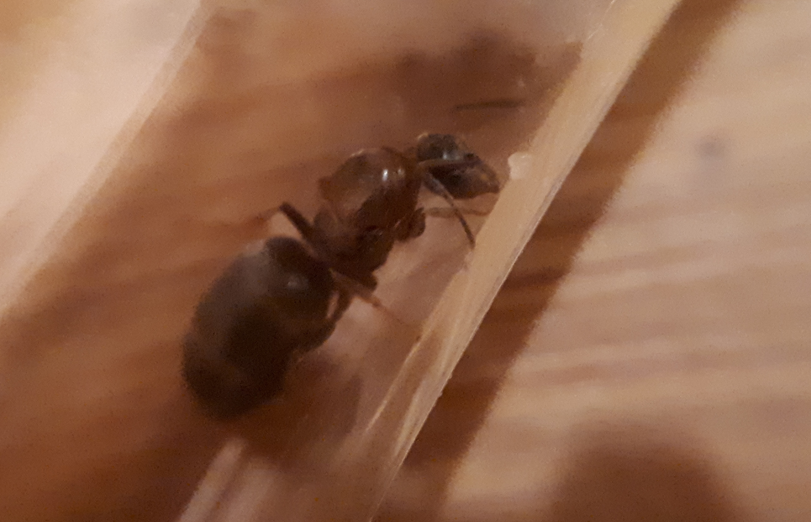 Deux mois, ça me paraît beaucoup pour avoir seulement une larve pour des Lasius niger, à moins que ce ne soit à cause des dérangements... en tout cas, pour mieux cibler leurs besoins, j'ai tenté de les prendre en photo. Mon smartphone d'entrée de gamme n'a pas des photos de qualité, même en l'aidant avec une lentille de grossissement, je n'obtiens pas de très bonnes photos... j'espère cependant que la seule pas trop trop floue que j'ai pu prendre suffira...