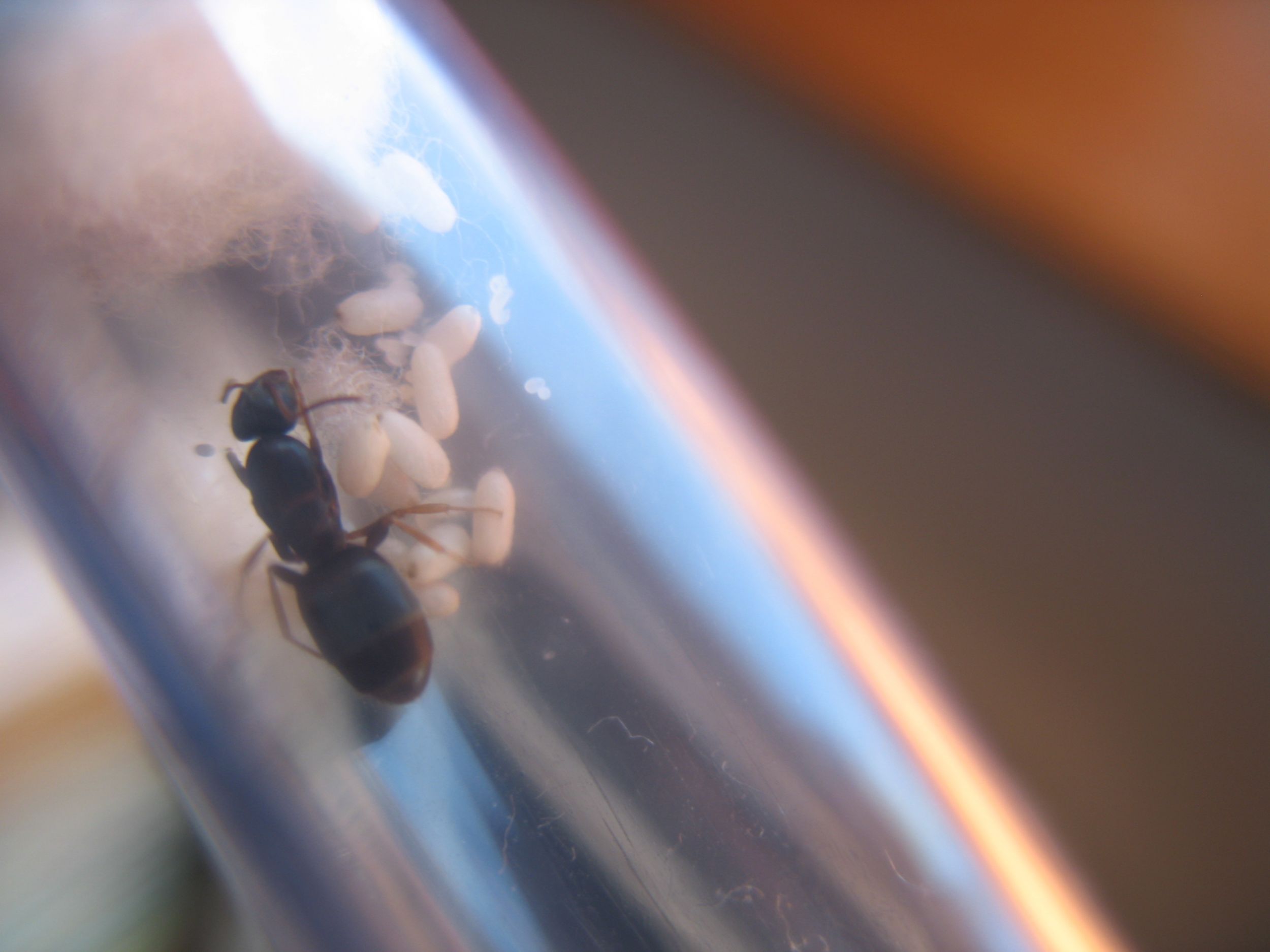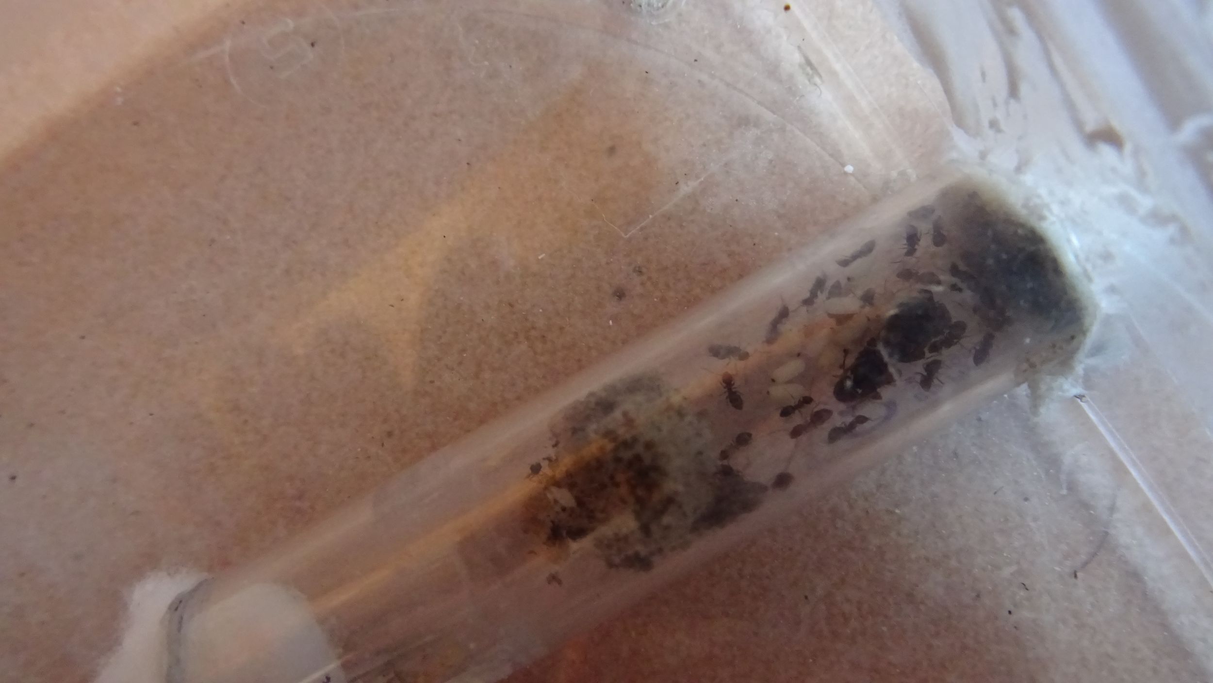 Tout ce qu'il y a de sûr c'est qu'elles m'ont fait une petite frayeur au moment de la mise en diapause : je les ai changées de tube et là, il n'y en avait plus que 15 et plus de couvain et impossible de les voir dans l'ancien tube. Je conservai celui-ci quelques jours sans y toucher, et c'est là que je découvrais une ouvrière s'y baladant. En fait, elle n'était pas toute seule, il y avait encore 15 ouvrières qui avaient réussi à forer le coton sec et à se ménager une cachette parfaite à l'intérieur. Je réussis à les récupérer, et en fait, c'est bien elles qui détenaient le couvain. J'ai donc une 15aine de larves qui attendent pour l'année prochaine. Je n'avais pas encore constaté un tel comportement pour des Lasius.