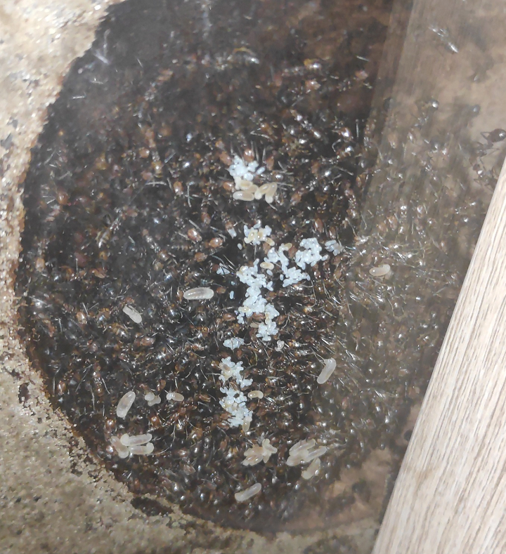 gyne de 2019, beaucoup de patience et de tranquillité pour cette espèce. Il ne faut pas se louper. Elles ont la réputation d’être plus difficiles à faire prospérer que les 2 autres colonies ci-dessus. Une reine et surement 2-3 ouvrières au départ, diapause effectuée, et actuellement un couvain plus que prometteur.