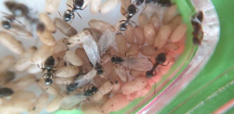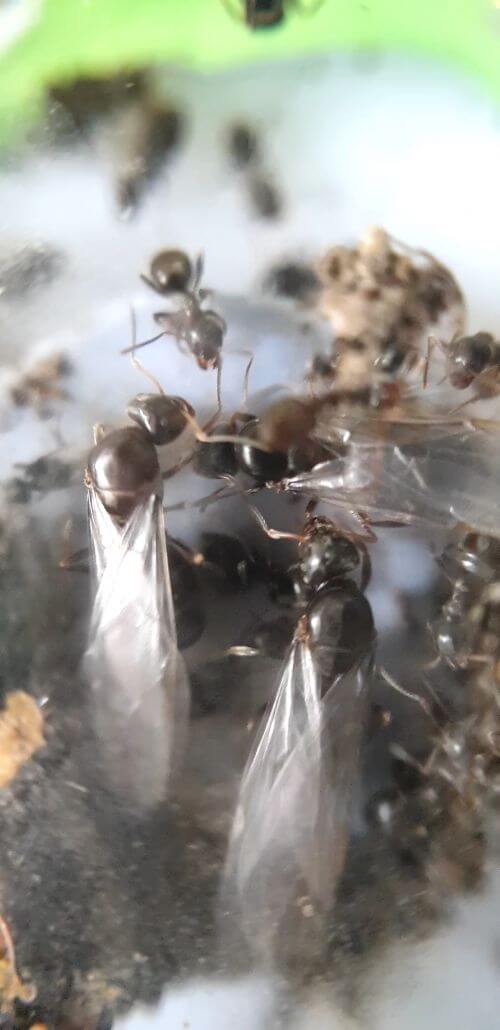 Quand elles sont passées de la terre au nid en plexiglas, il y avait une plus grosse fourmi avec des ailes.