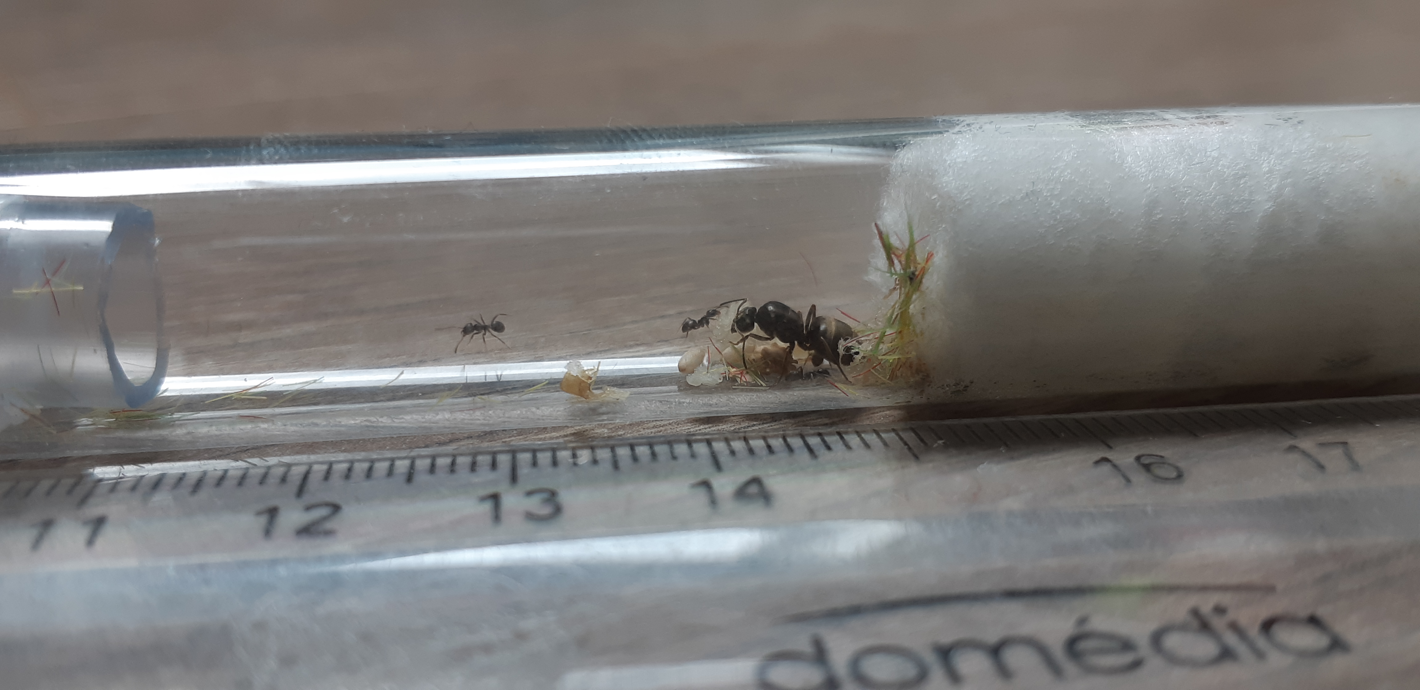 essaimage de centaines de fourmis ailées. J'en ai recueilli deux sur les pavés de la vielle ville et une dans les bois à proximité. Sur les trois une est morte lors d'une journée particulièrement chaude mais les deux autres ont bien pondu et ont déjà leurs premières ouvrières. C'est pourquoi j'espère que vous pourrez m'aider à identifier l'espèce car cela fait tout juste 1 an que j'ai commencé et à part les