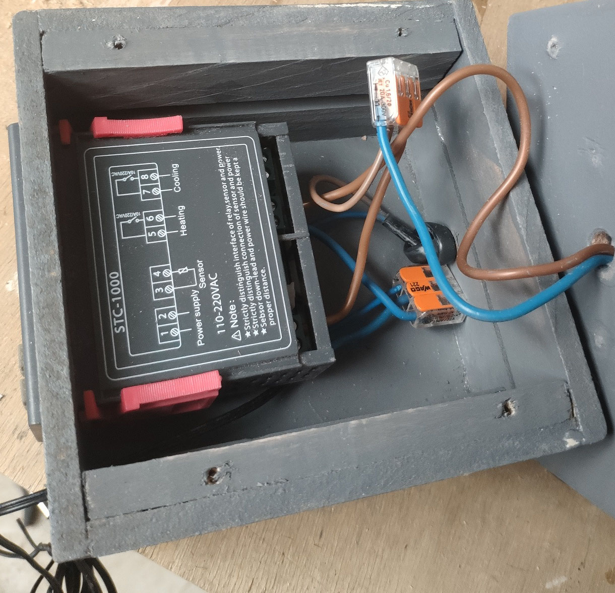 Du coup j'ai acheté un régulateur de température STC-1000, un câble chauffant pour terrarium 4 m 15 W et je me suis fait un boiter pour commander l'allumage d'une prise où sera branché le câble pour chauffer l'intérieur du réfrigérateur.
