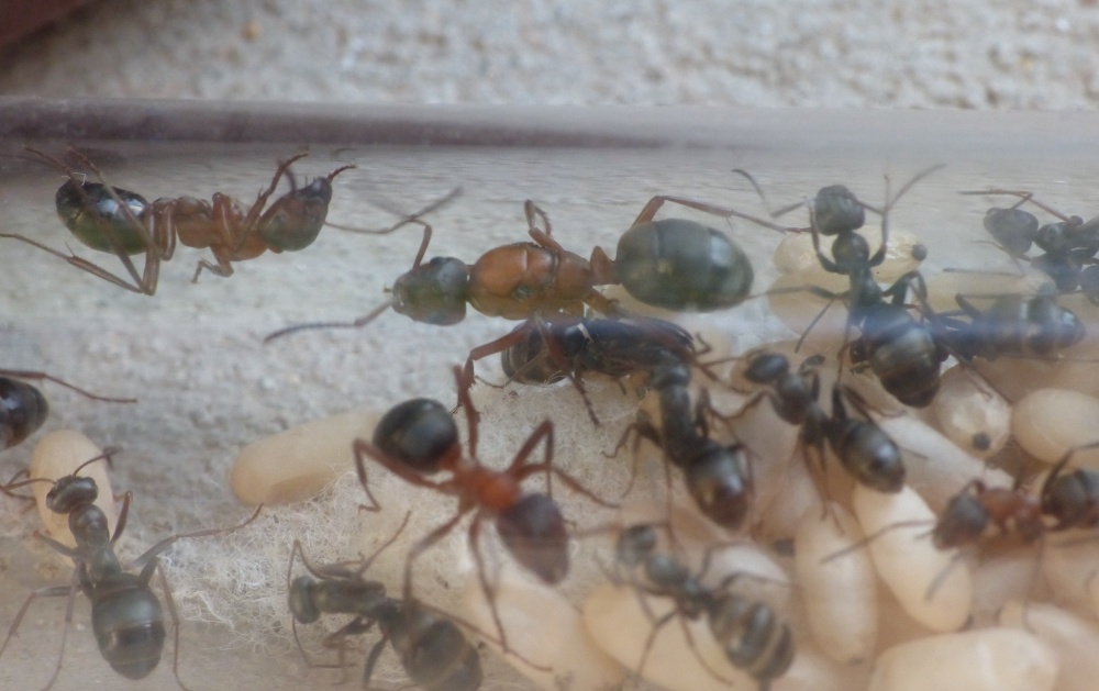 Pendant ce temps, les 2 ouvrières semblent reléguées au rôle de nourrices, sûrement en partie à cause de leur jeune âge. Elle ne sortent quasiment pas et ne montent pas la garde, la gyne s'occupe de tout. Celle-ci se poste maintenant souvent à l'entrée du tube, montant la garde parfois mandibules écartées, et en faisant de réguliers trajets vers le couvain.