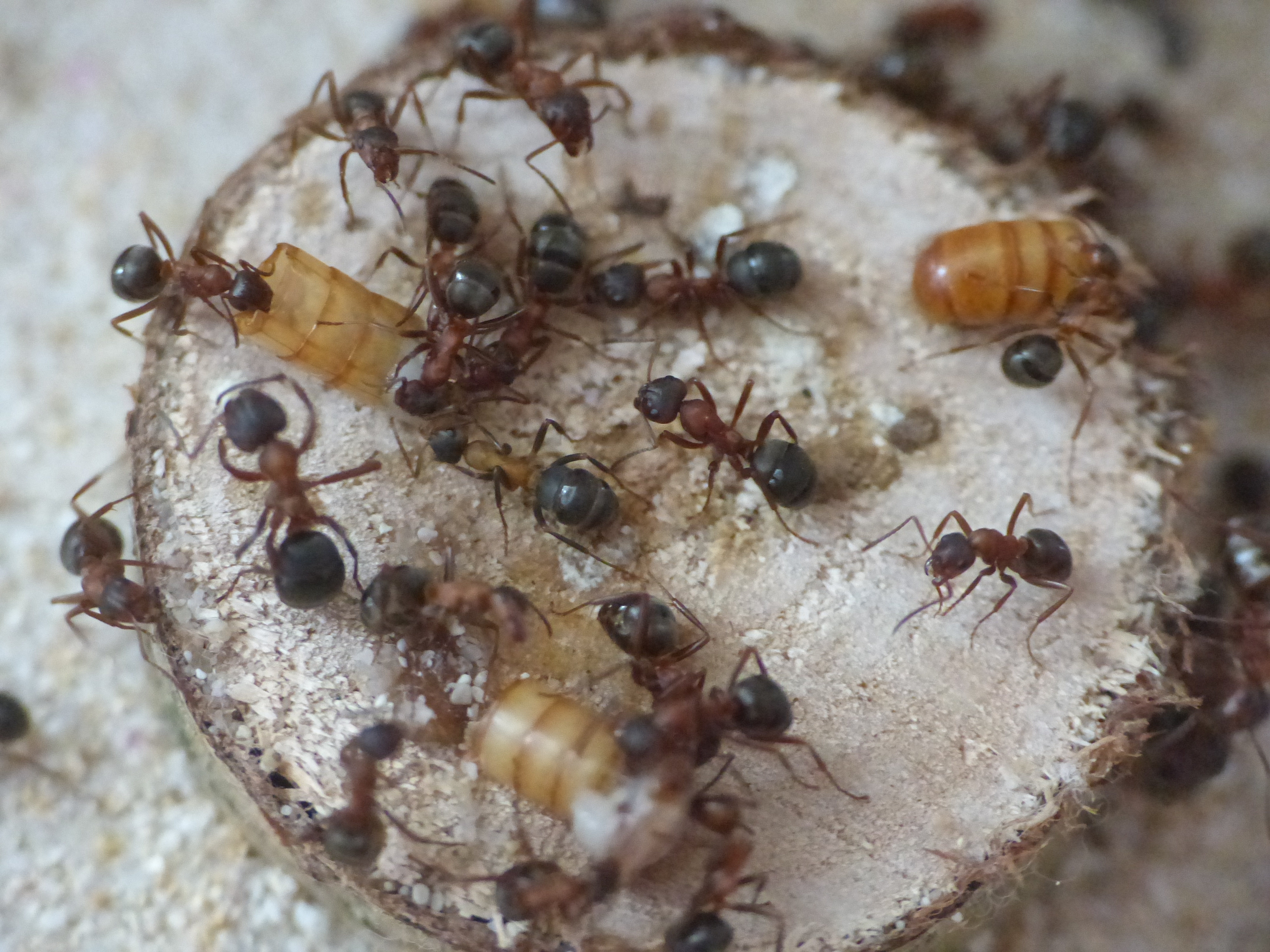 Notre gyne démarre donc avec, à la louche, une quarantaine de cocons et nymphes nues. Le progrès ne tarde pas, et après une unique nuit passée au chalet, 2 ouvrières Serviformica sont déjà nées !